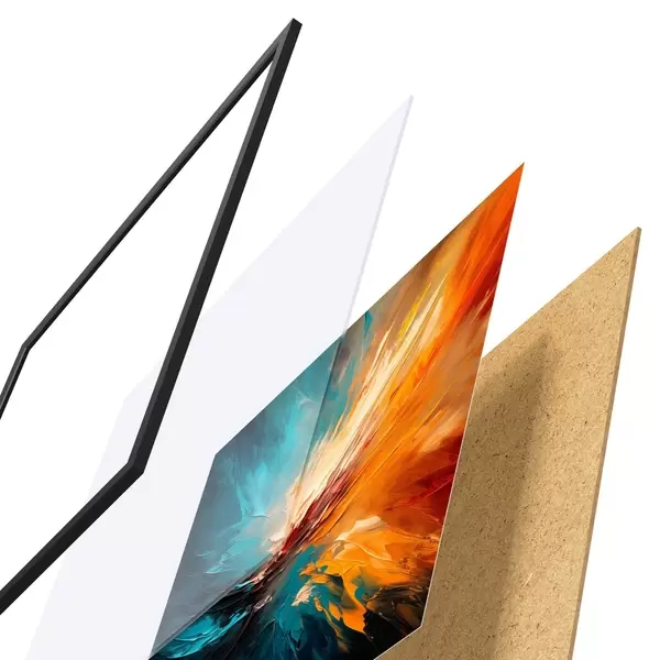 Le poster se compose d'un cadre, d'un plexiglas, d'une image imprimée et d'un support en aggloméré. Le poster peut être immédiatement accroché au mur grâce aux fixations au dos.