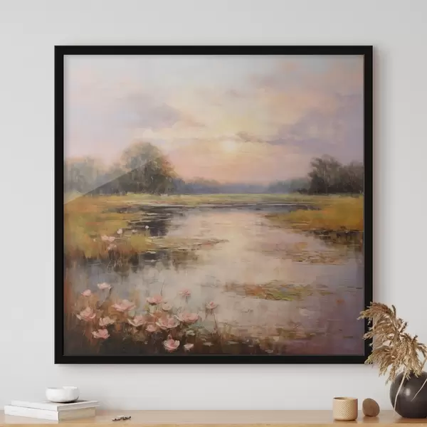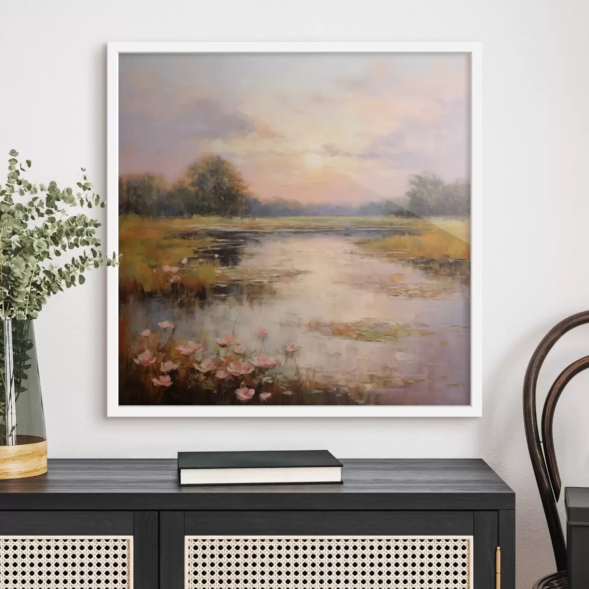 Affiche Plan d'eau avec des fleurs au coucher du soleil f44044