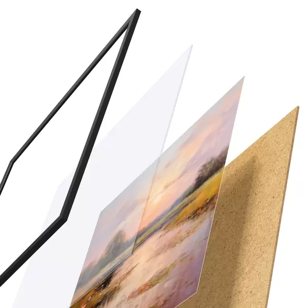 Le poster se compose d'un cadre, d'un plexiglas, d'une image imprimée et d'un support en aggloméré. Le poster peut être immédiatement accroché au mur grâce aux fixations au dos.