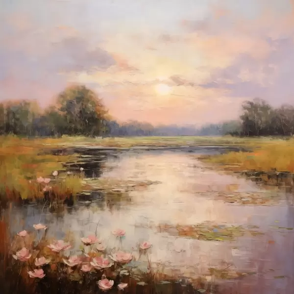 Affiche Plan d'eau avec des fleurs au coucher du soleil Non f44044
