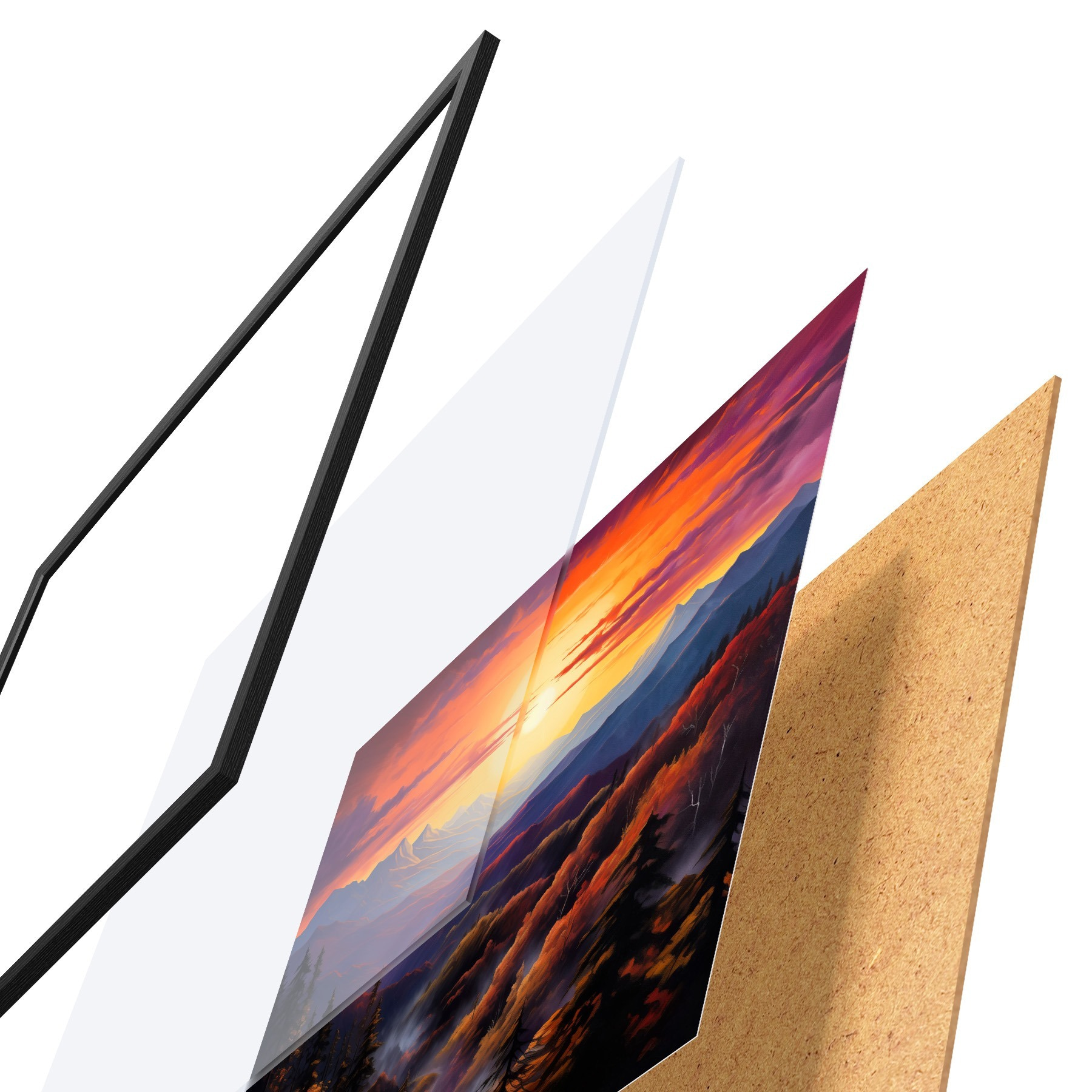 Le poster se compose d'un cadre, d'un plexiglas, d'une image imprimée et d'un support en aggloméré. Le poster peut être immédiatement accroché au mur grâce aux fixations au dos.