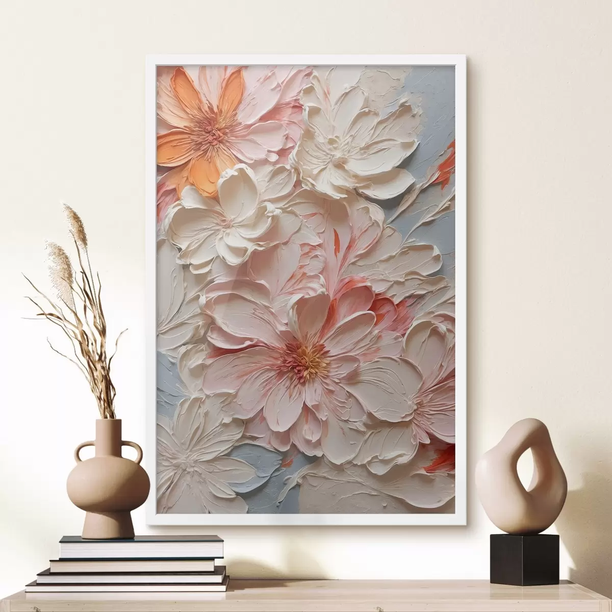 Affiche Fleurs blanches et roses sur fond bleu dans le style d'une peinture à l'huile Non f44074