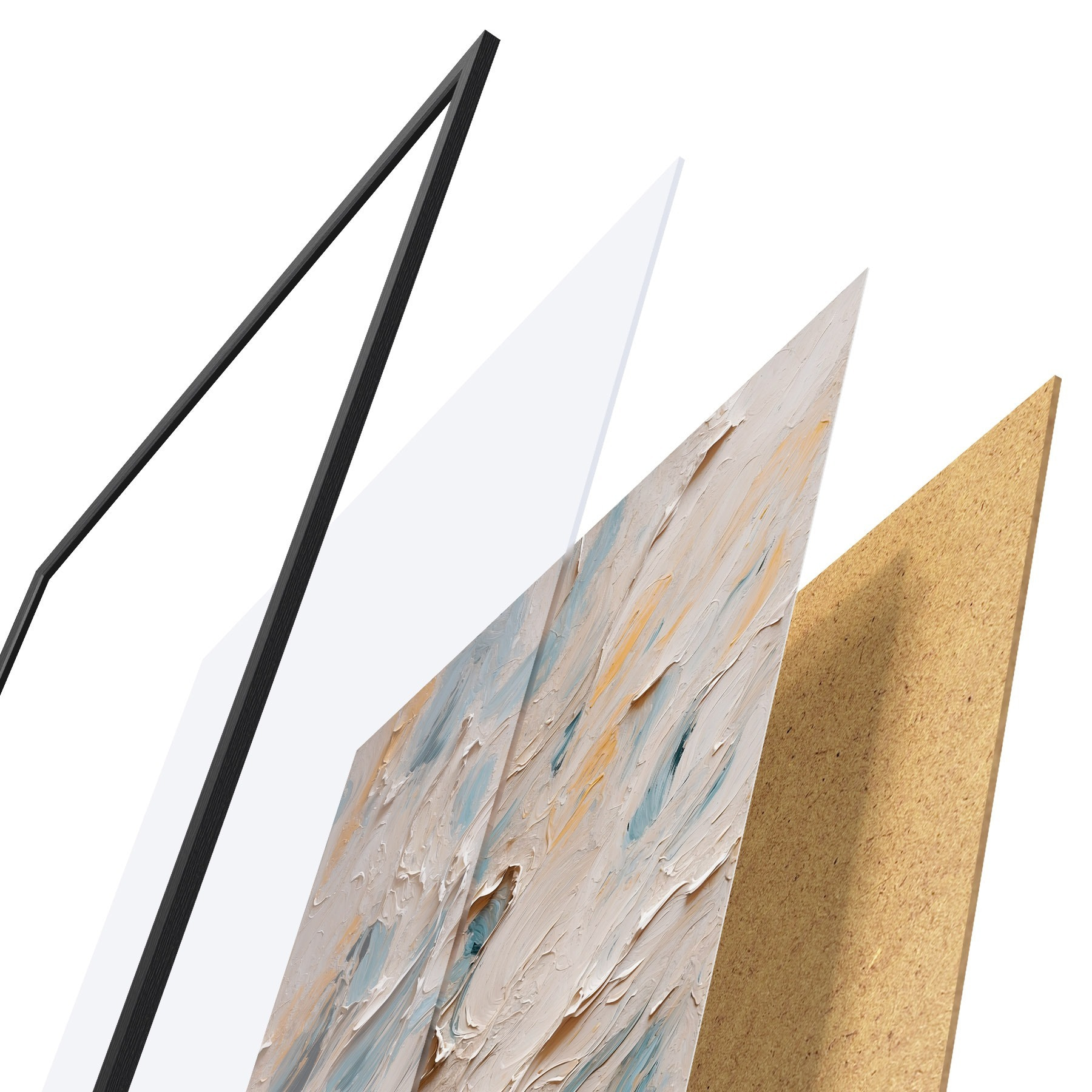 Le poster se compose d'un cadre, d'un plexiglas, d'une image imprimée et d'un support en aggloméré. Le poster peut être immédiatement accroché au mur grâce aux fixations au dos.