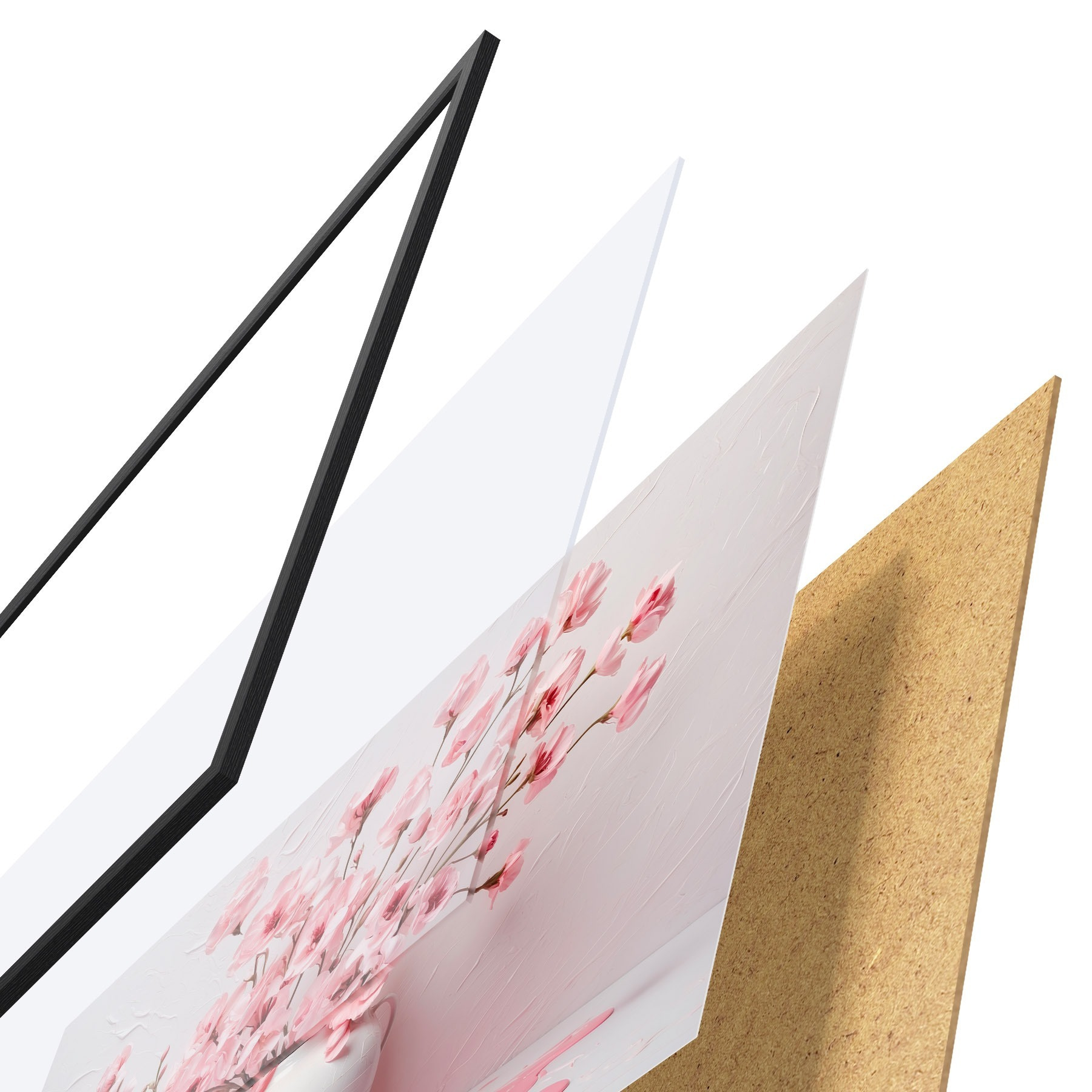Le poster se compose d'un cadre, d'un plexiglas, d'une image imprimée et d'un support en aggloméré. Le poster peut être immédiatement accroché au mur grâce aux fixations au dos.