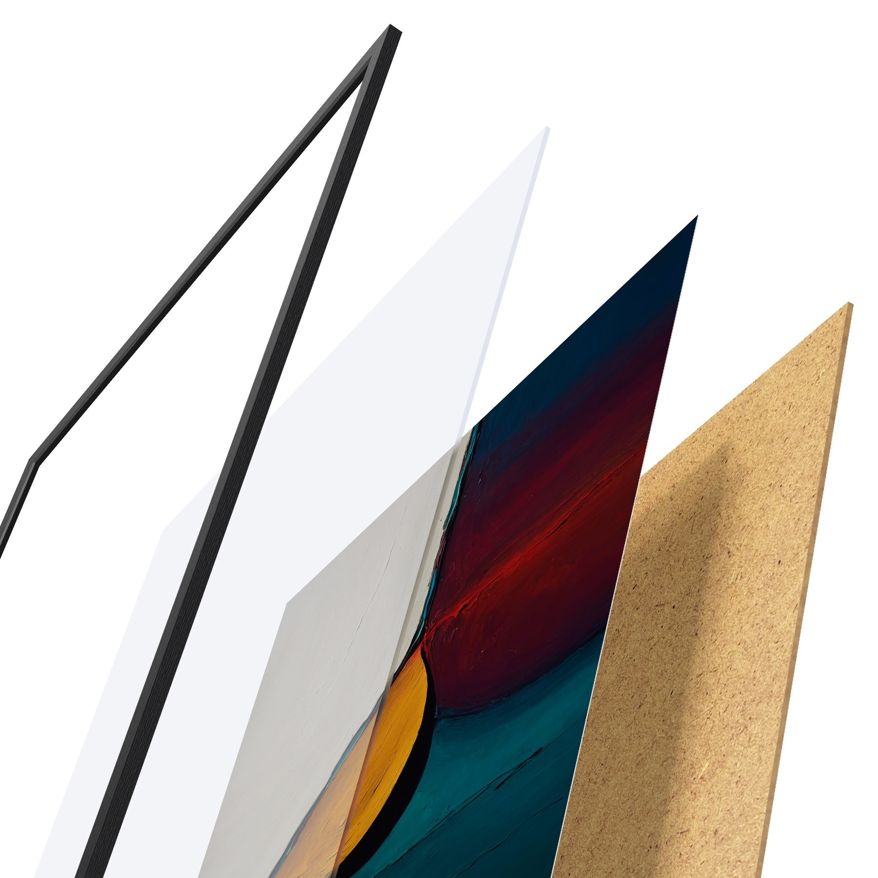 Le poster se compose d'un cadre, d'un plexiglas, d'une image imprimée et d'un support en aggloméré. Le poster peut être immédiatement accroché au mur grâce aux fixations au dos.