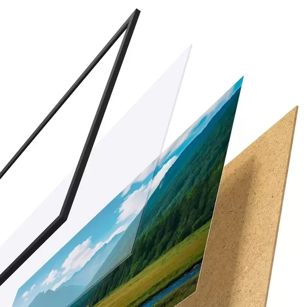 Le poster se compose d'un cadre, d'un plexiglas, d'une image imprimée et d'un support en aggloméré. Le poster peut être immédiatement accroché au mur grâce aux fixations au dos.