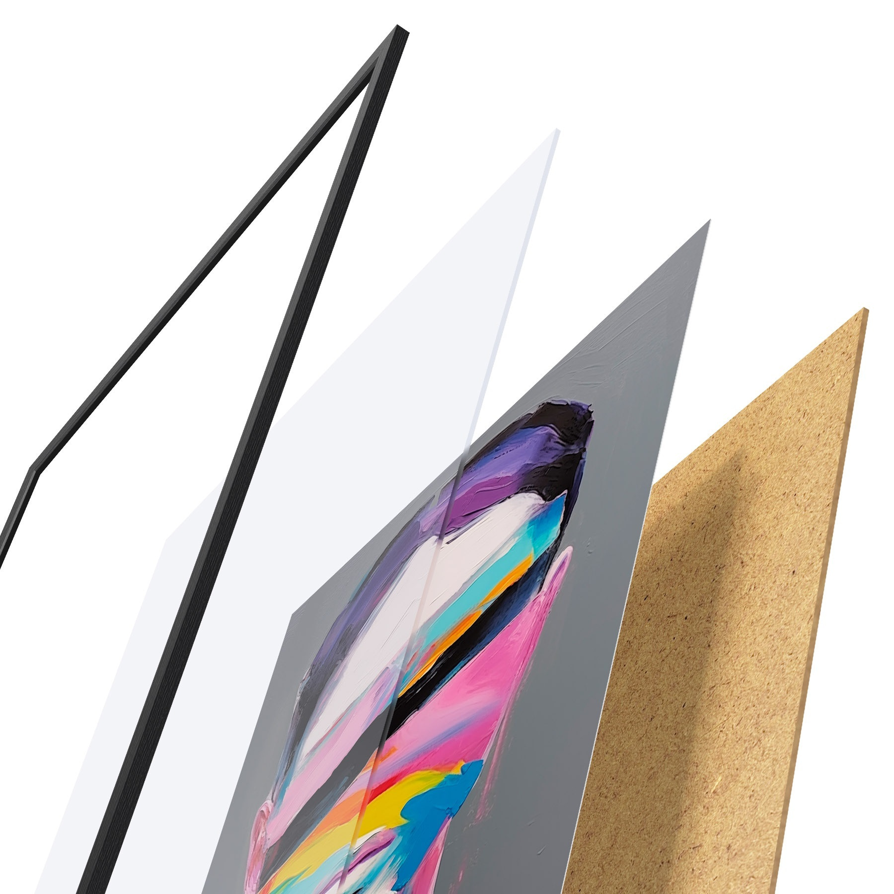 Le poster se compose d'un cadre, d'un plexiglas, d'une image imprimée et d'un support en aggloméré. Le poster peut être immédiatement accroché au mur grâce aux fixations au dos.
