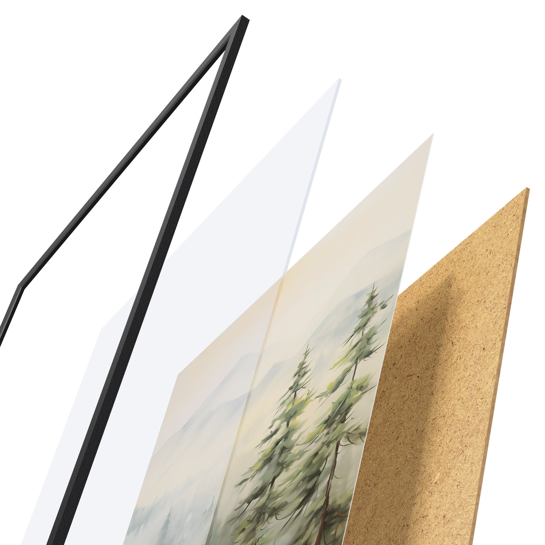 Le poster se compose d'un cadre, d'un plexiglas, d'une image imprimée et d'un support en aggloméré. Le poster peut être immédiatement accroché au mur grâce aux fixations au dos.