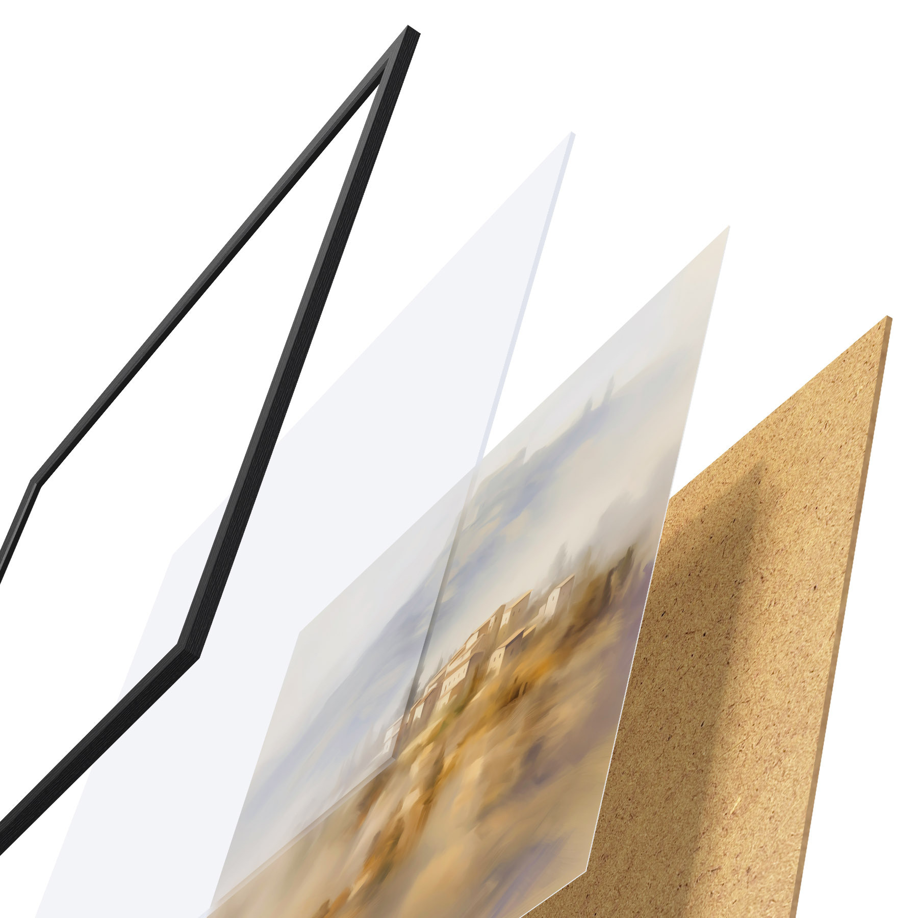 Le poster se compose d'un cadre, d'un plexiglas, d'une image imprimée et d'un support en aggloméré. Le poster peut être immédiatement accroché au mur grâce aux fixations au dos.