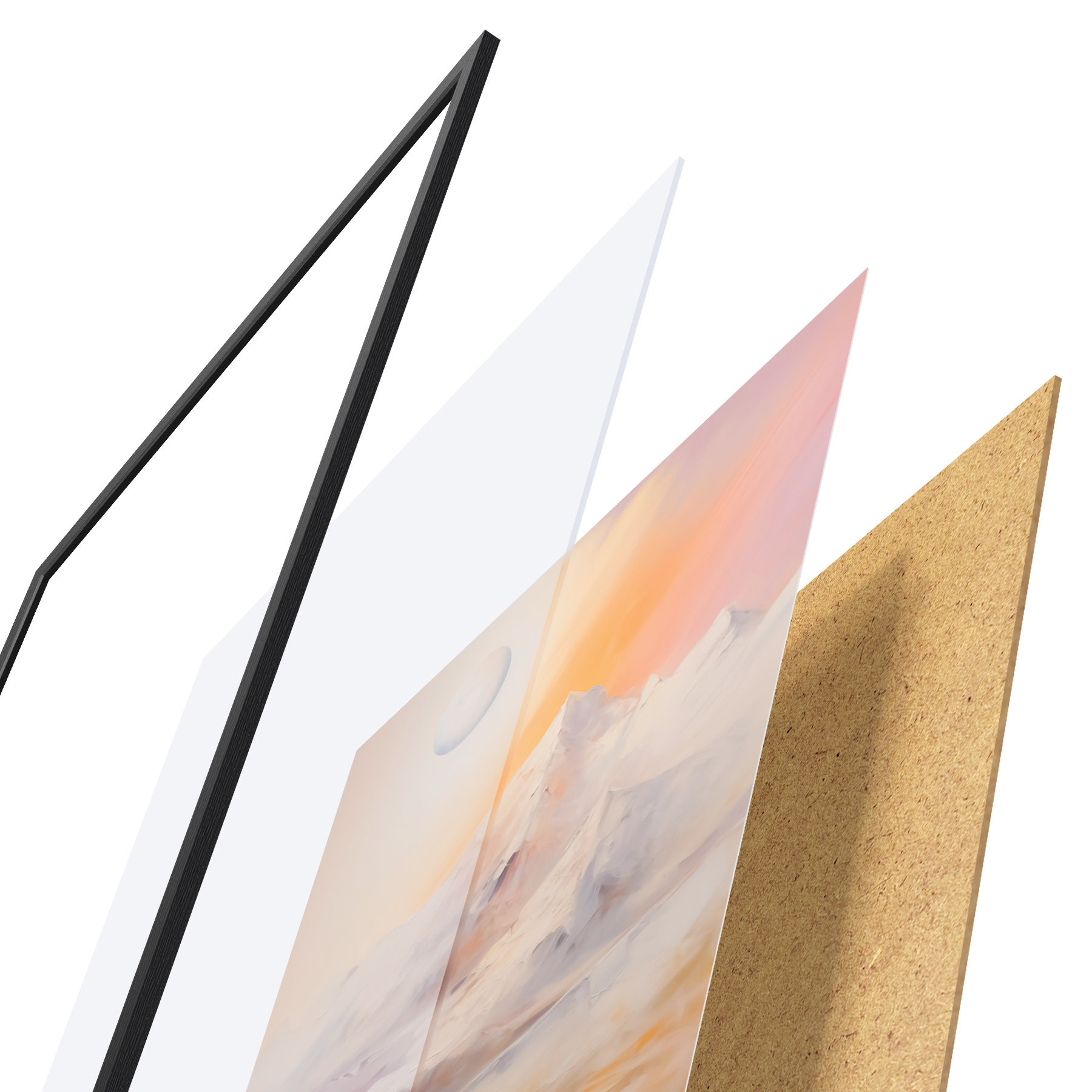 Le poster se compose d'un cadre, d'un plexiglas, d'une image imprimée et d'un support en aggloméré. Le poster peut être immédiatement accroché au mur grâce aux fixations au dos.