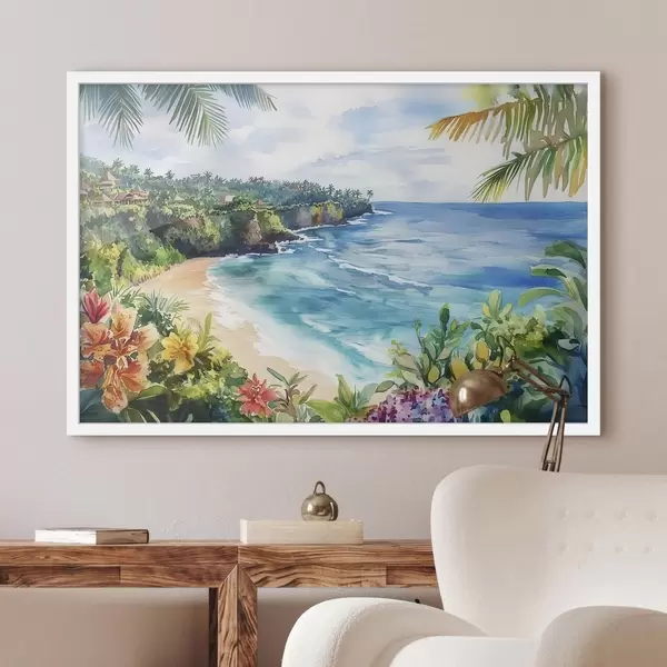 Affiche Plage tropicale, palmiers, fleurs, style aquarelle f44145