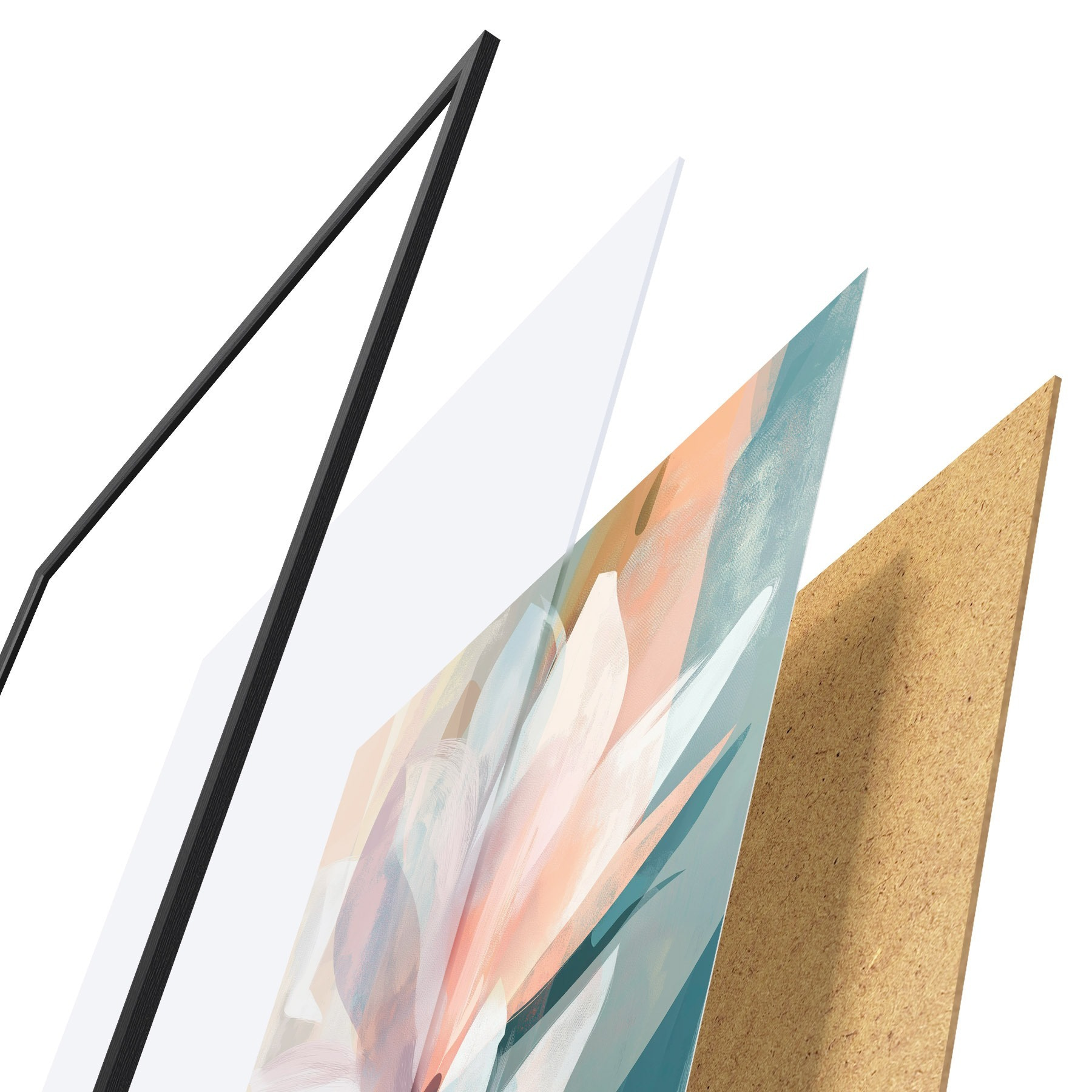 Le poster se compose d'un cadre, d'un plexiglas, d'une image imprimée et d'un support en aggloméré. Le poster peut être immédiatement accroché au mur grâce aux fixations au dos.