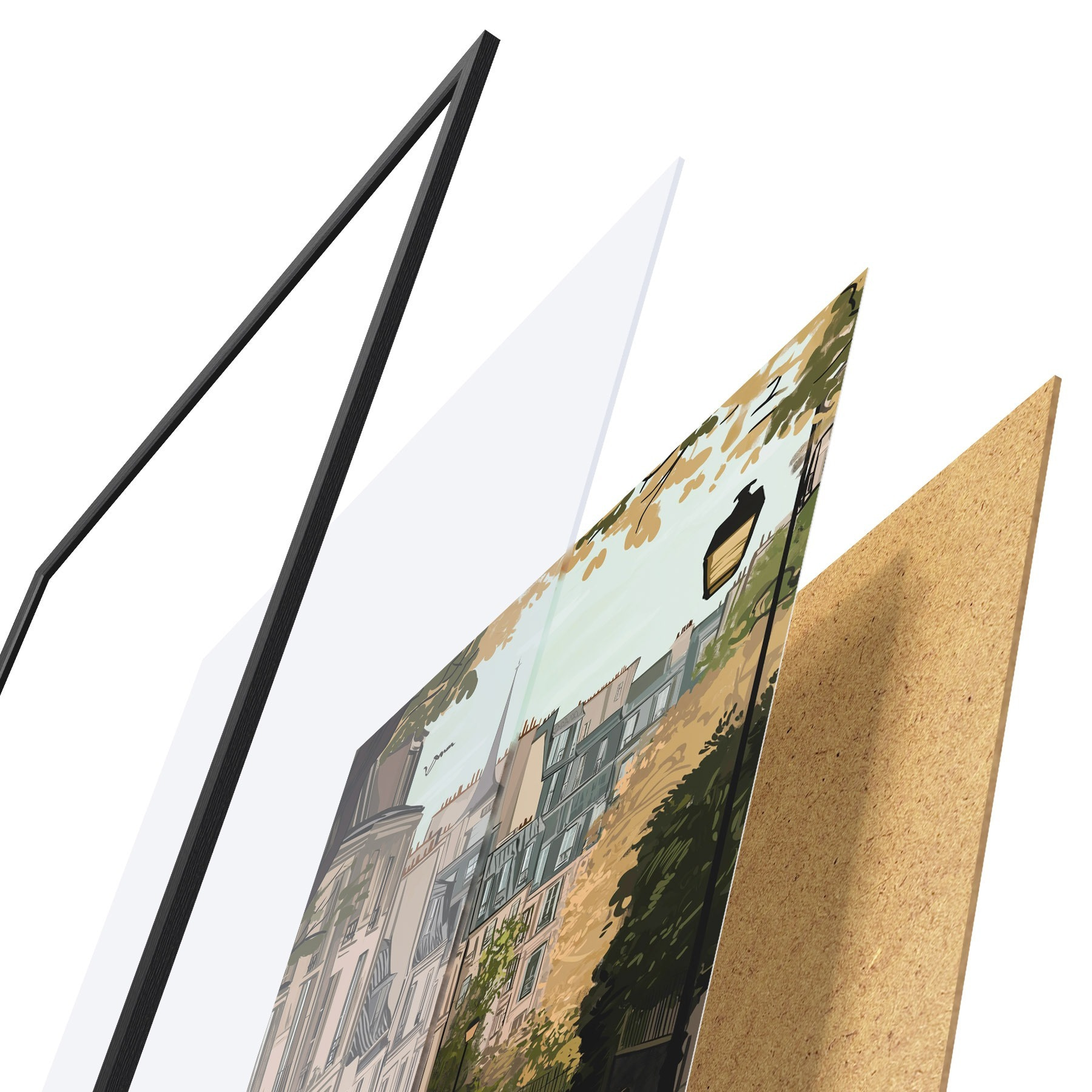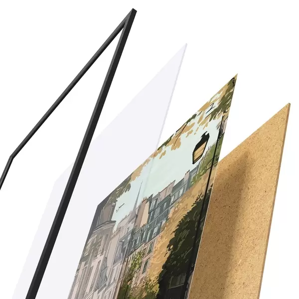 Le poster se compose d'un cadre, d'un plexiglas, d'une image imprimée et d'un support en aggloméré. Le poster peut être immédiatement accroché au mur grâce aux fixations au dos.