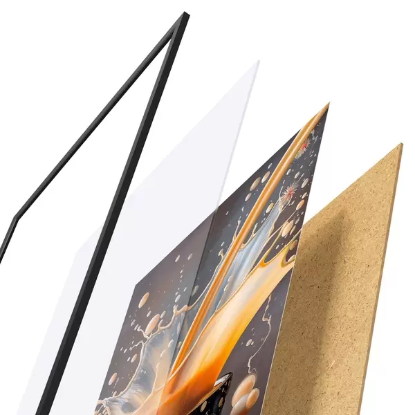 Le poster se compose d'un cadre, d'un plexiglas, d'une image imprimée et d'un support en aggloméré. Le poster peut être immédiatement accroché au mur grâce aux fixations au dos.