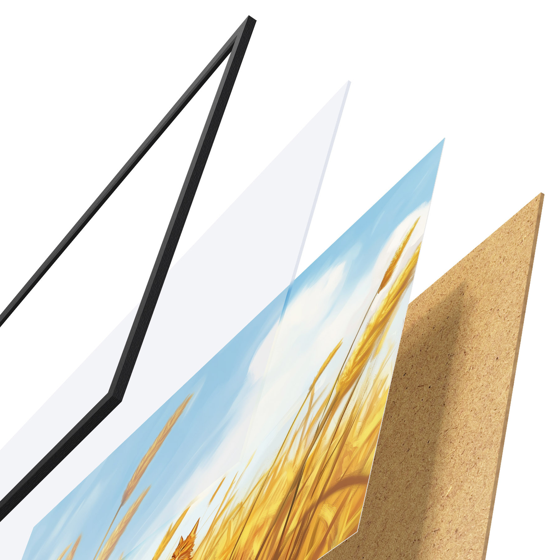 Le poster se compose d'un cadre, d'un plexiglas, d'une image imprimée et d'un support en aggloméré. Le poster peut être immédiatement accroché au mur grâce aux fixations au dos.