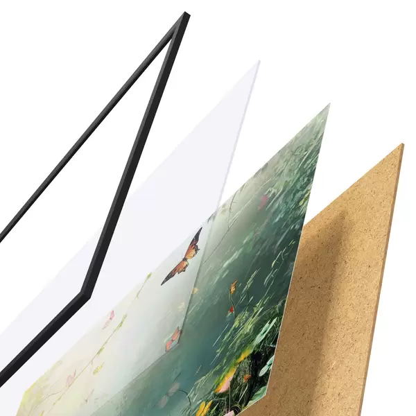 Le poster se compose d'un cadre, d'un plexiglas, d'une image imprimée et d'un support en aggloméré. Le poster peut être immédiatement accroché au mur grâce aux fixations au dos.