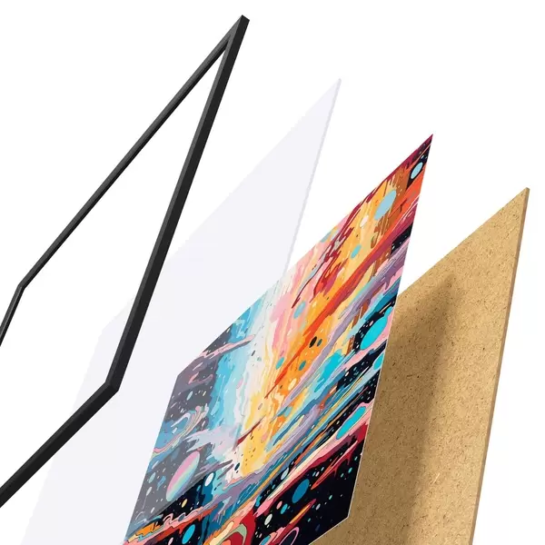 Le poster se compose d'un cadre, d'un plexiglas, d'une image imprimée et d'un support en aggloméré. Le poster peut être immédiatement accroché au mur grâce aux fixations au dos.