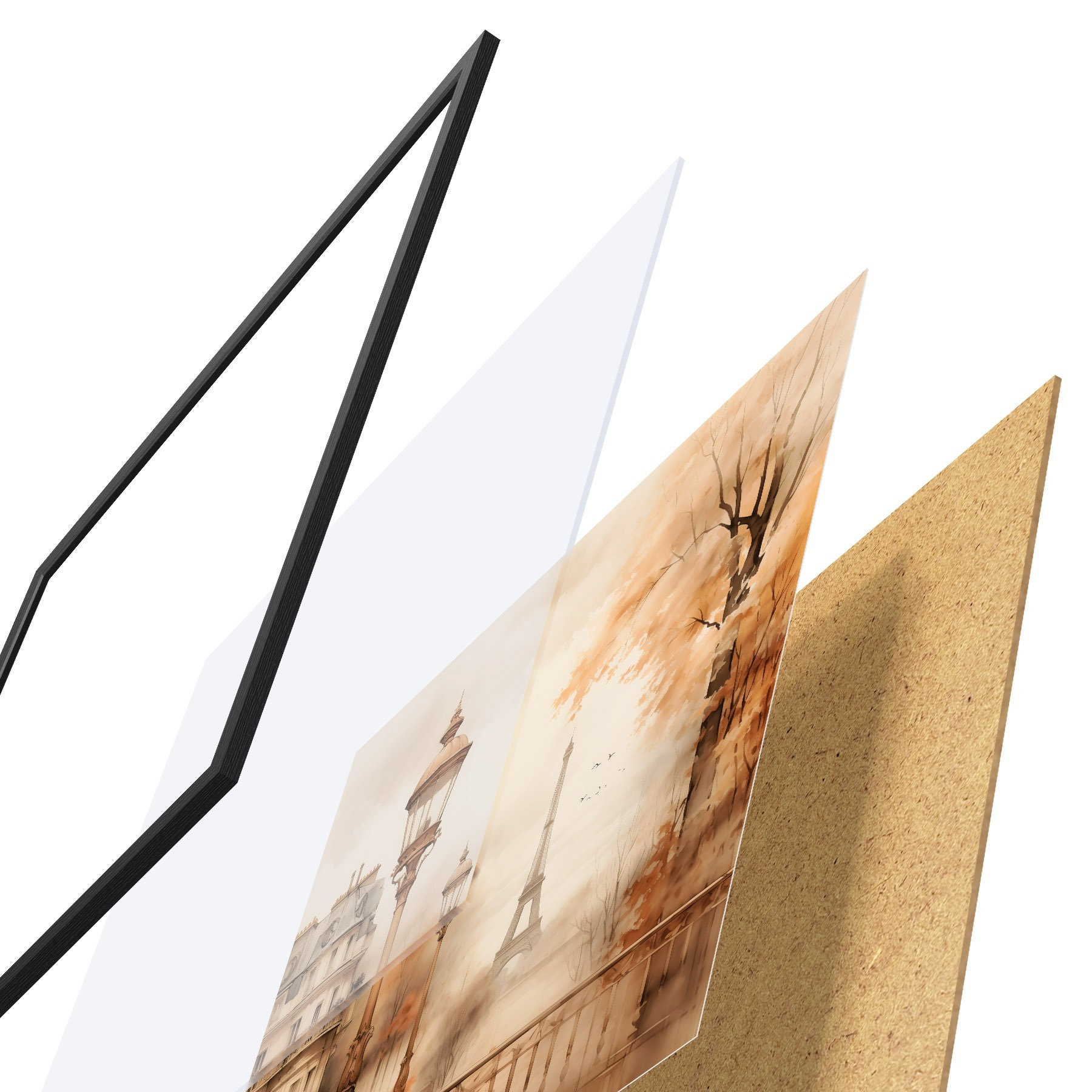 Le poster se compose d'un cadre, d'un plexiglas, d'une image imprimée et d'un support en aggloméré. Le poster peut être immédiatement accroché au mur grâce aux fixations au dos.