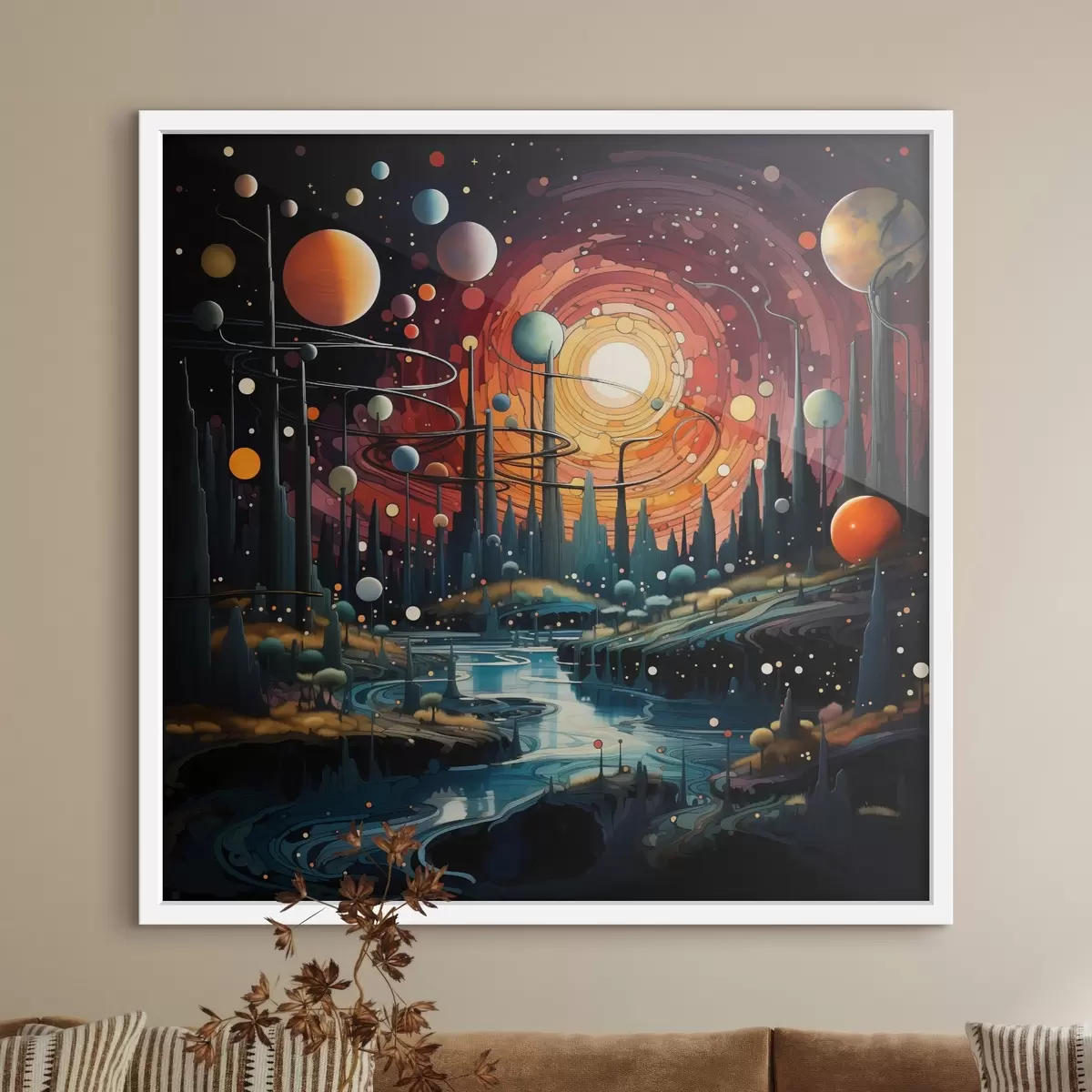 Affiche Paysage lumineux et fantastique d'un monde extraterrestre avec des planètes et une rivière Non f44249