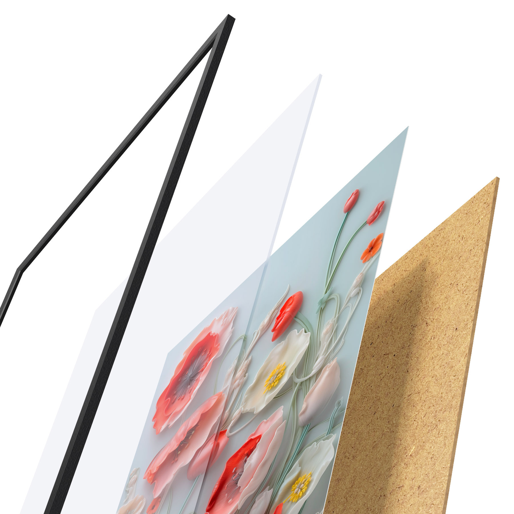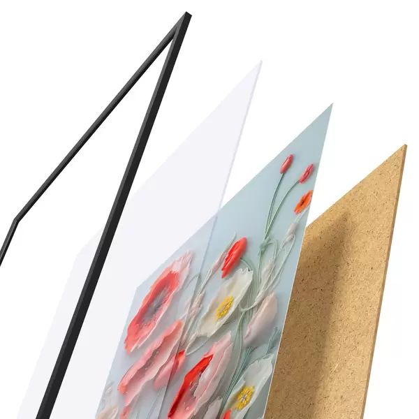 Le poster se compose d'un cadre, d'un plexiglas, d'une image imprimée et d'un support en aggloméré. Le poster peut être immédiatement accroché au mur grâce aux fixations au dos.