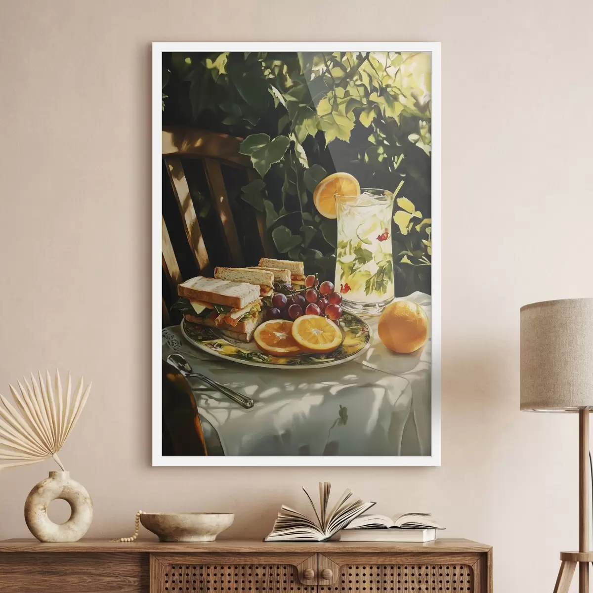 Affiche Pique-nique esthétique dans le jardin d'été, sandwichs, oranges, limonade f44306