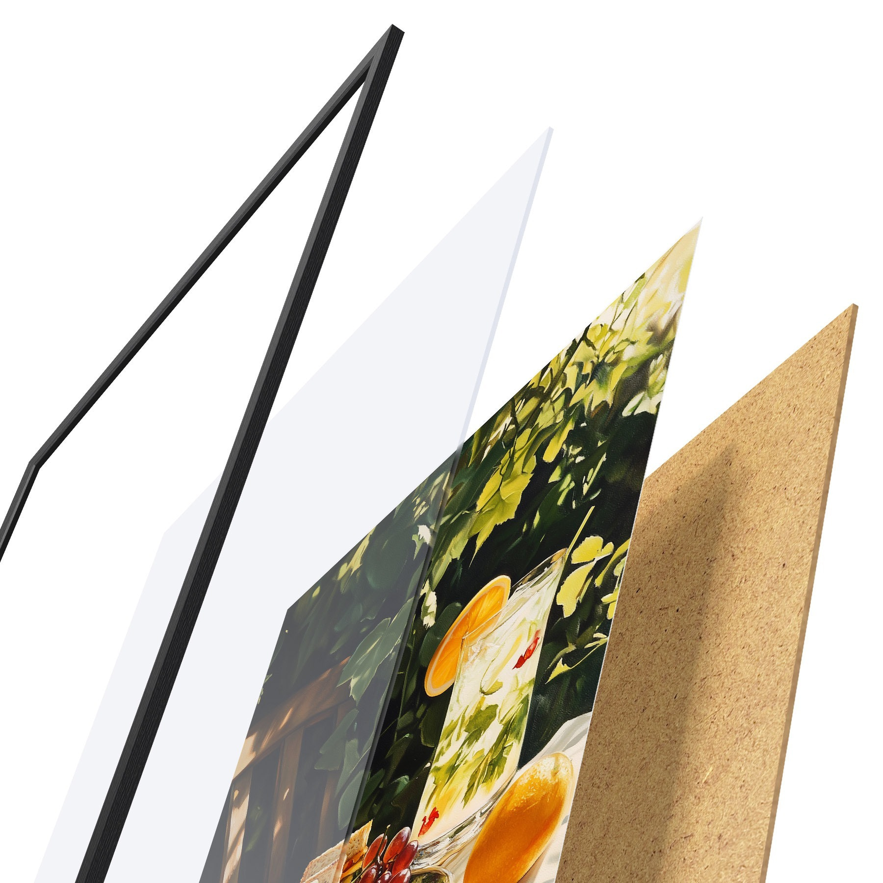 Le poster se compose d'un cadre, d'un plexiglas, d'une image imprimée et d'un support en aggloméré. Le poster peut être immédiatement accroché au mur grâce aux fixations au dos.