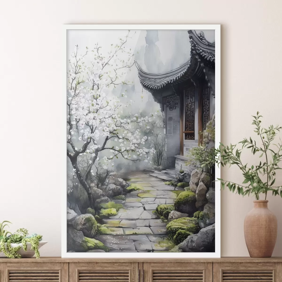 Affiche Jardin japonais avec cerisier et maison, oriental, style aquarelle f44309