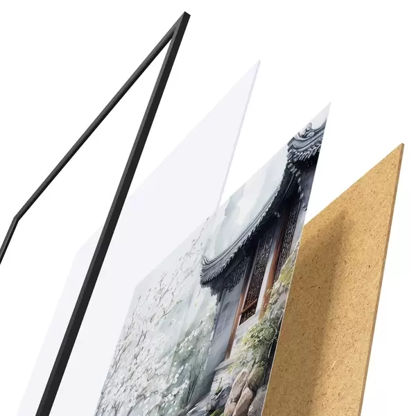 Le poster se compose d'un cadre, d'un plexiglas, d'une image imprimée et d'un support en aggloméré. Le poster peut être immédiatement accroché au mur grâce aux fixations au dos.