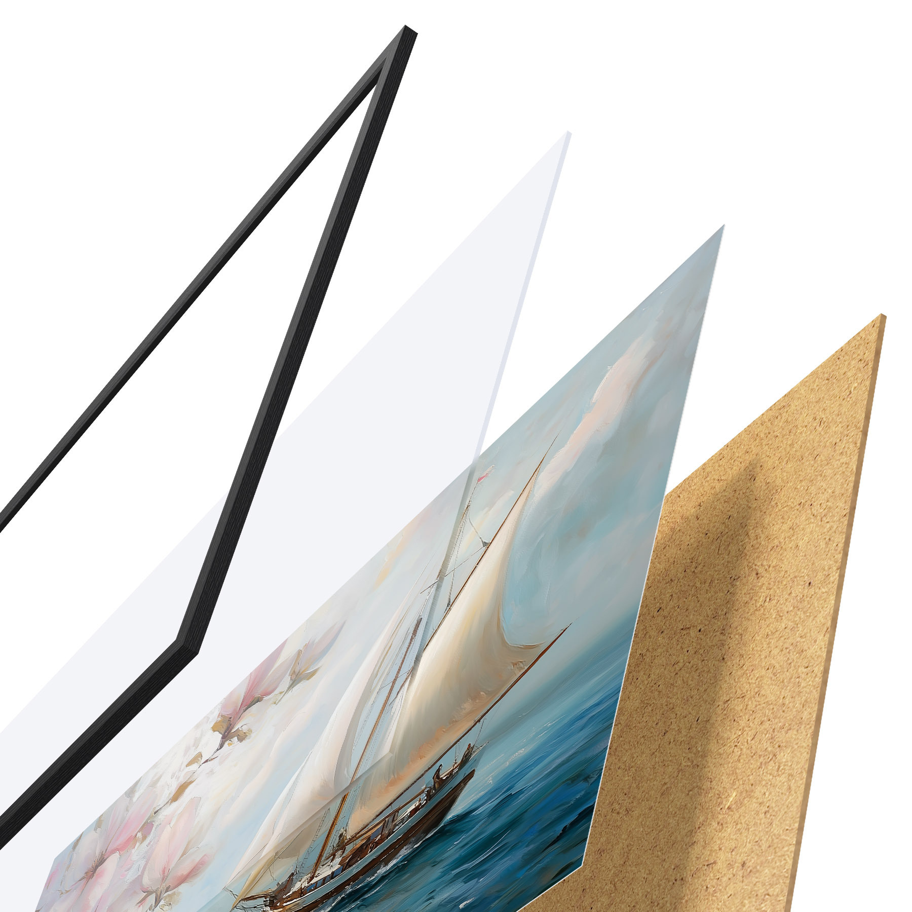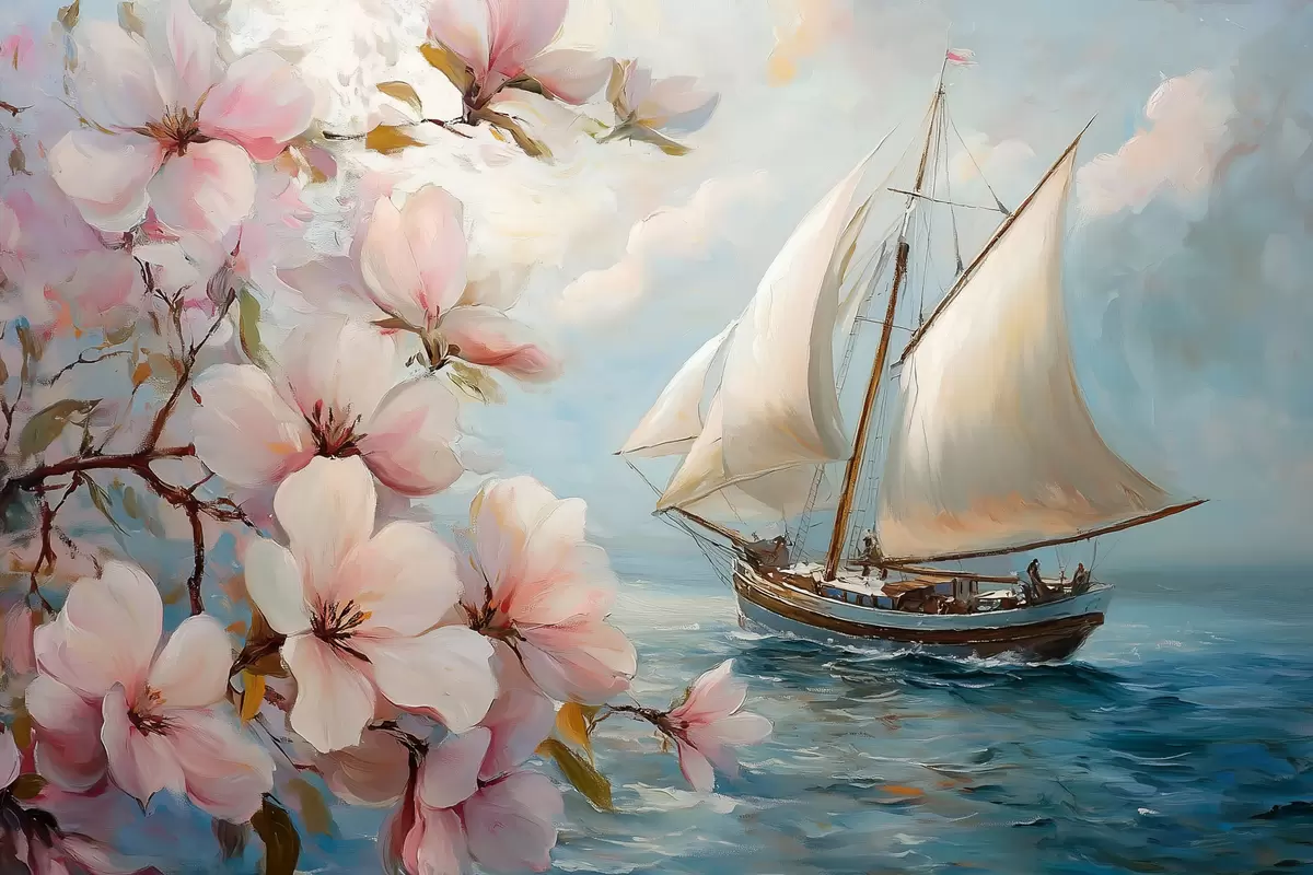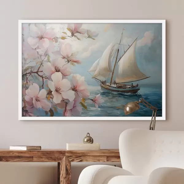 Affiche Bateau sur la mer et grandes fleurs Non f44330