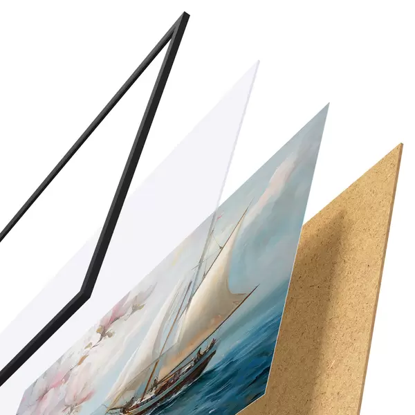 Le poster se compose d'un cadre, d'un plexiglas, d'une image imprimée et d'un support en aggloméré. Le poster peut être immédiatement accroché au mur grâce aux fixations au dos.