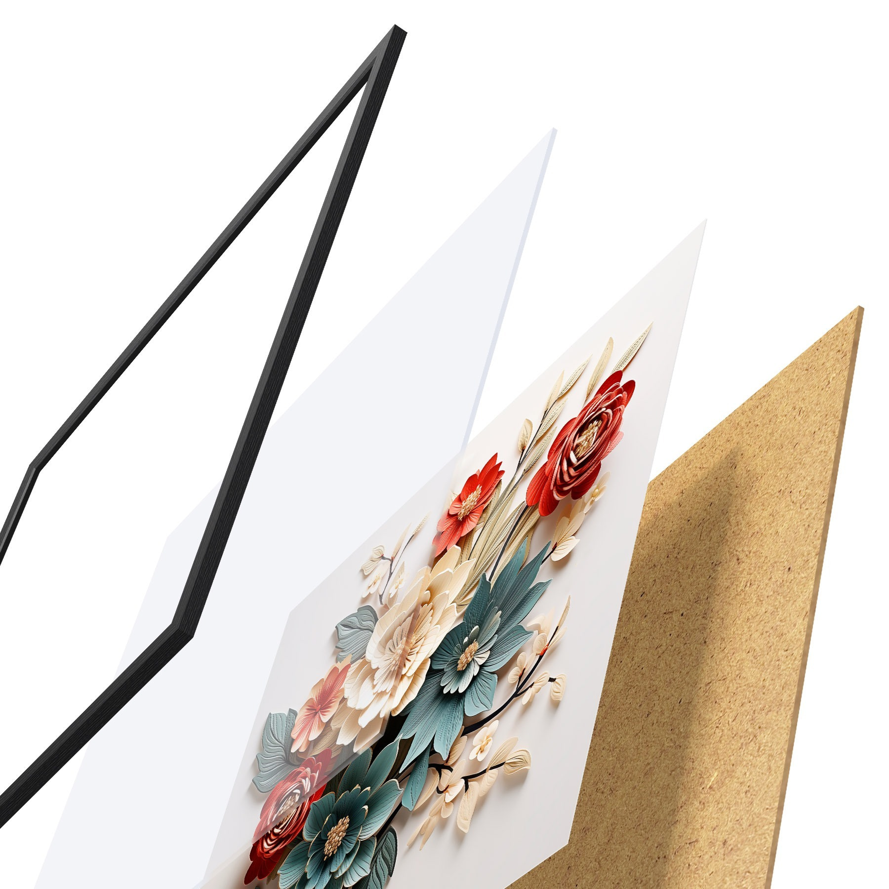 Le poster se compose d'un cadre, d'un plexiglas, d'une image imprimée et d'un support en aggloméré. Le poster peut être immédiatement accroché au mur grâce aux fixations au dos.