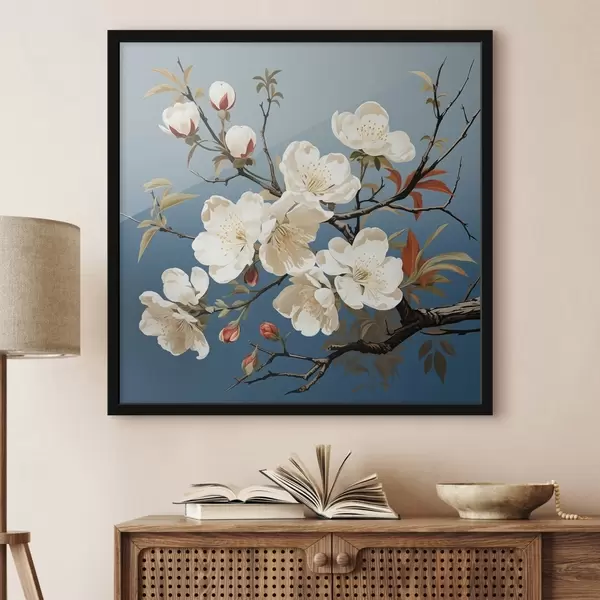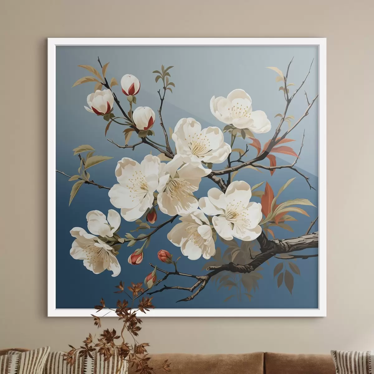 Affiche Branche de magnolia avec bourgeons rougeâtres sur fond bleu f44341