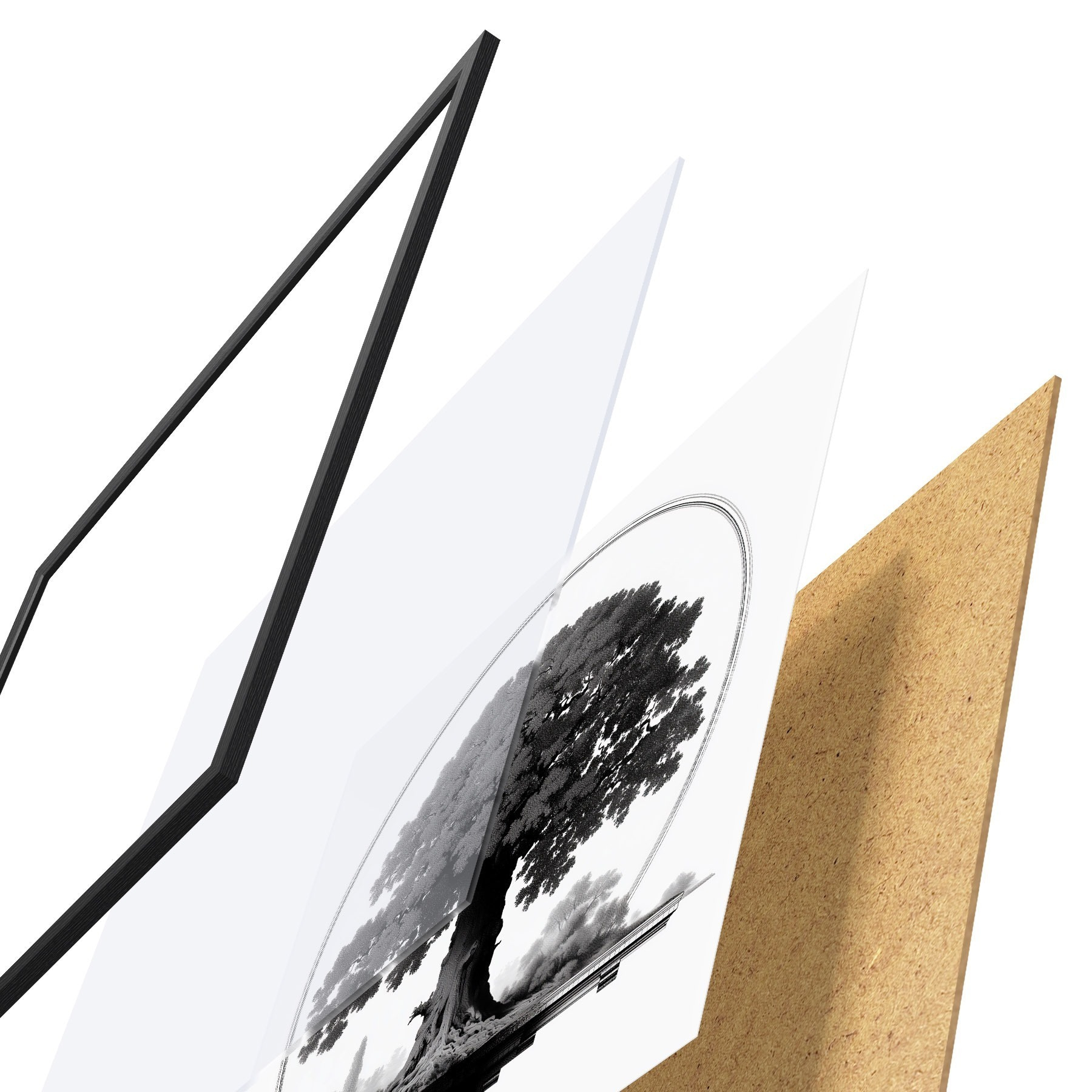 Le poster se compose d'un cadre, d'un plexiglas, d'une image imprimée et d'un support en aggloméré. Le poster peut être immédiatement accroché au mur grâce aux fixations au dos.