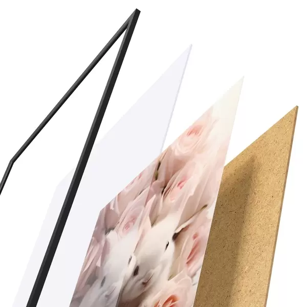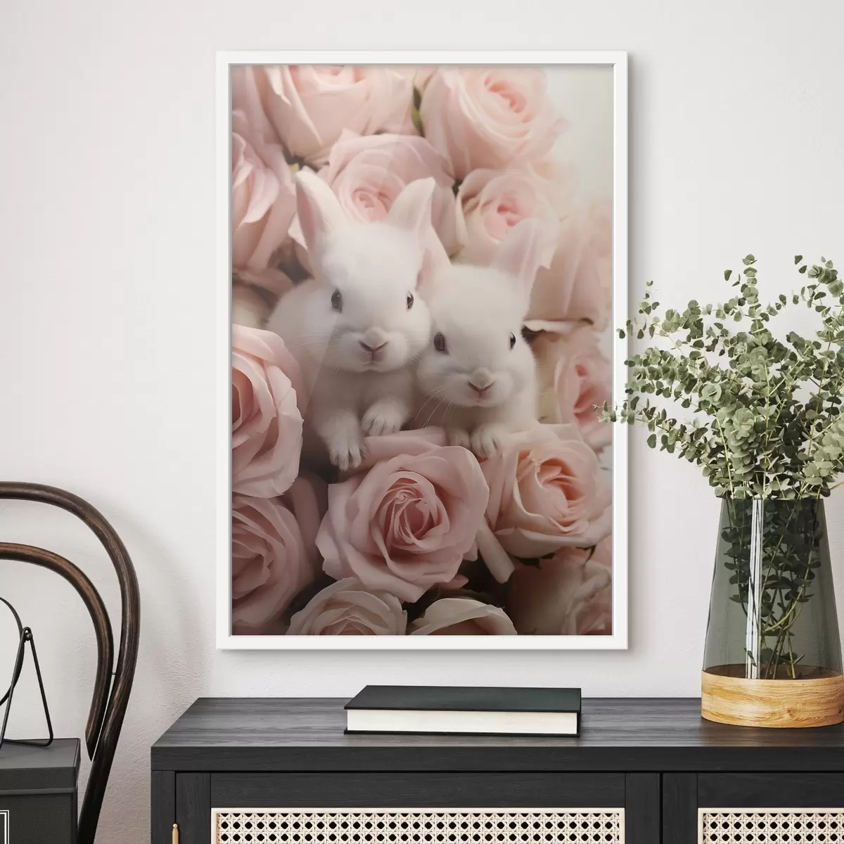 Affiche Deux lapins blancs dans des fleurs de roses délicates f44380