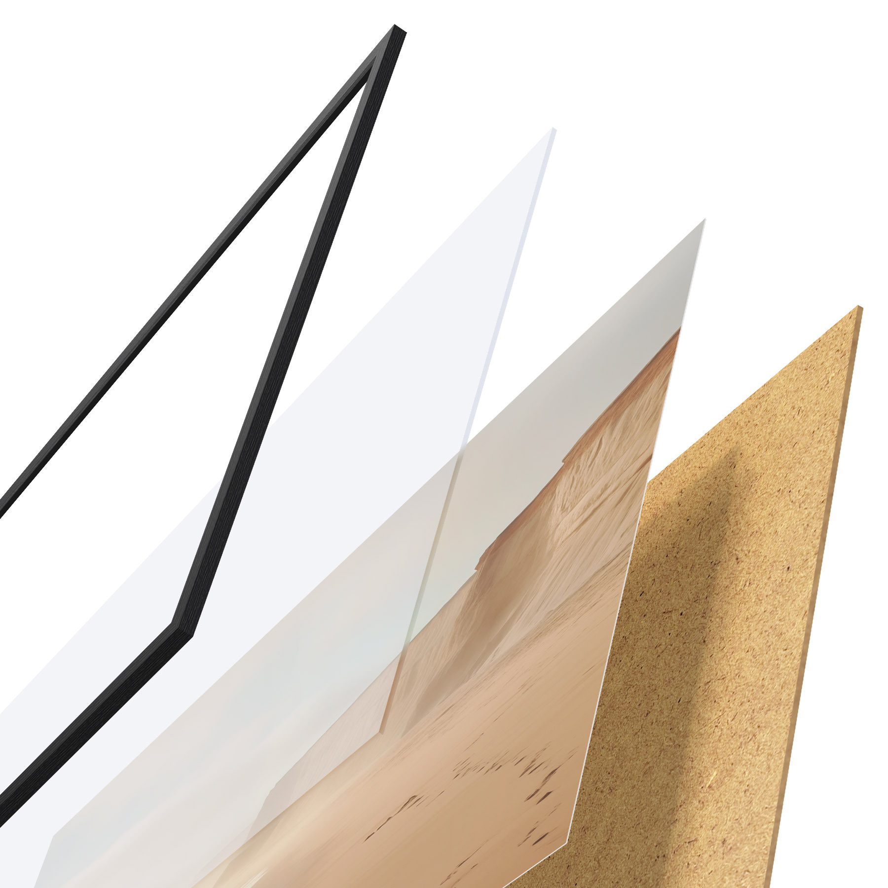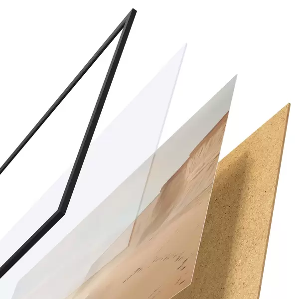 Le poster se compose d'un cadre, d'un plexiglas, d'une image imprimée et d'un support en aggloméré. Le poster peut être immédiatement accroché au mur grâce aux fixations au dos.