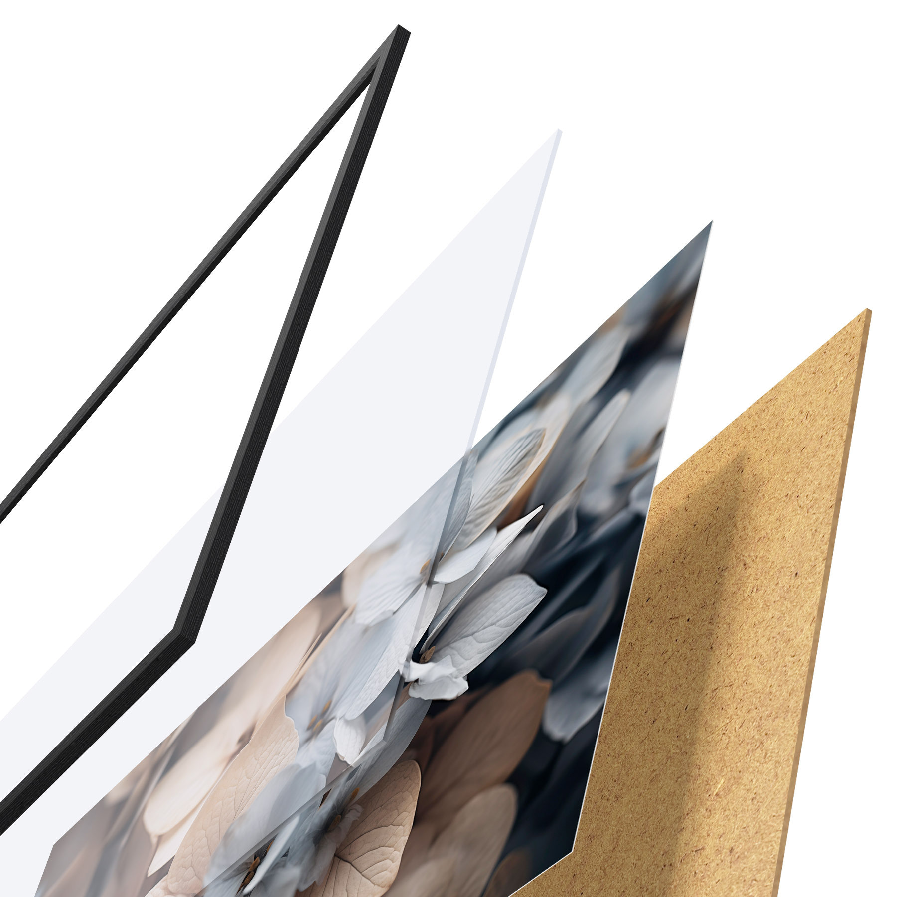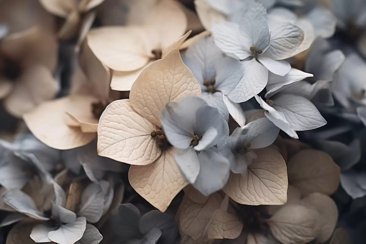 Affiche Fleurs d'hortensia, pétales bleu clair et beige, avec textures détaillées, arrangement floral élégant Non f44394