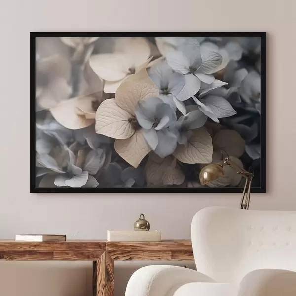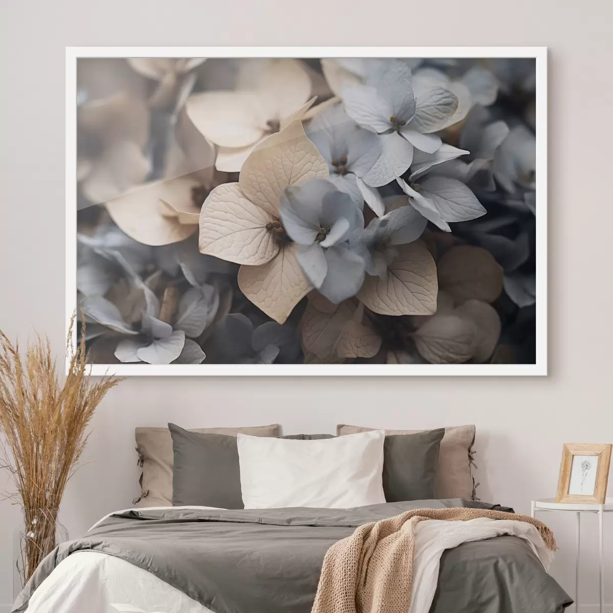 Affiche Fleurs d'hortensia, pétales bleu clair et beige, avec textures détaillées, arrangement floral élégant f44394