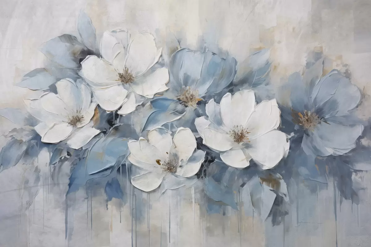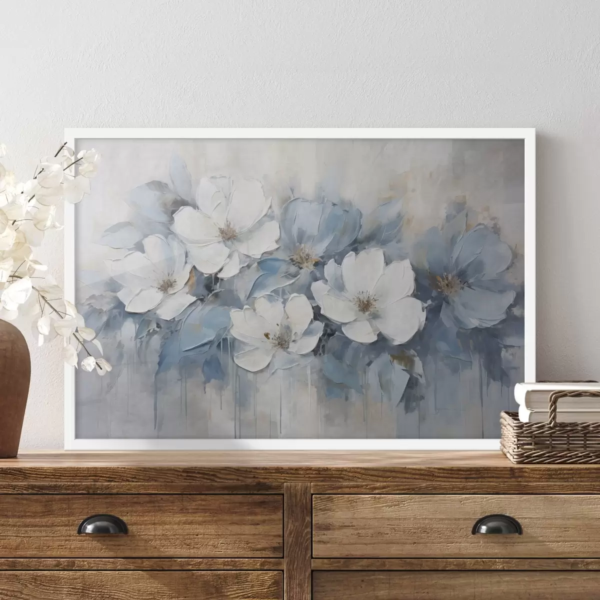 Affiche Fleurs blanches avec des feuilles bleues, sur un fond beige clair, avec des coups de pinceau visibles f44395