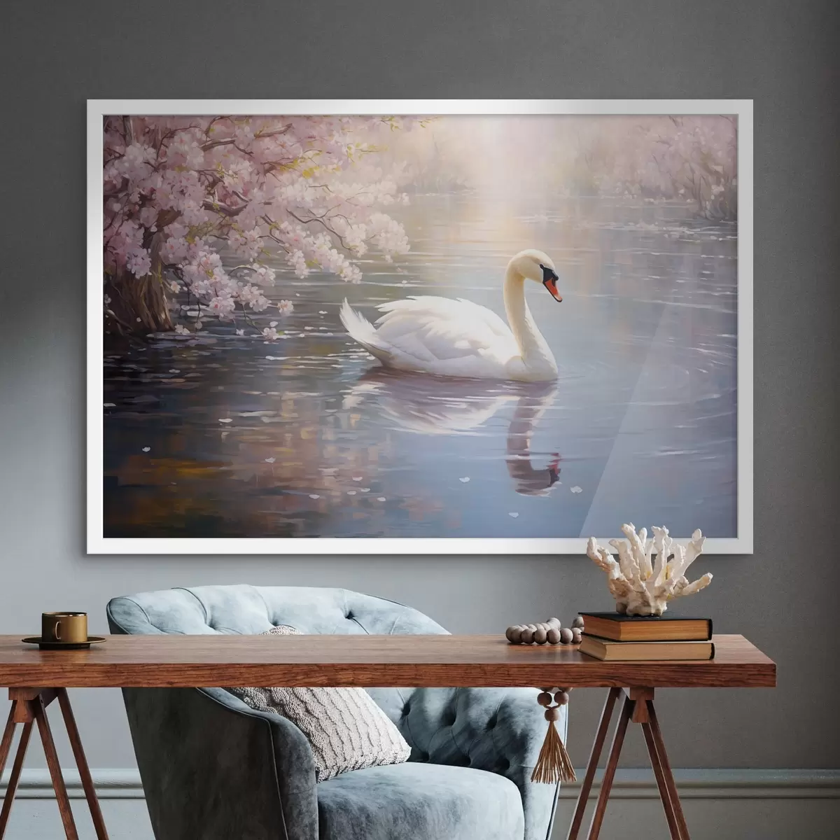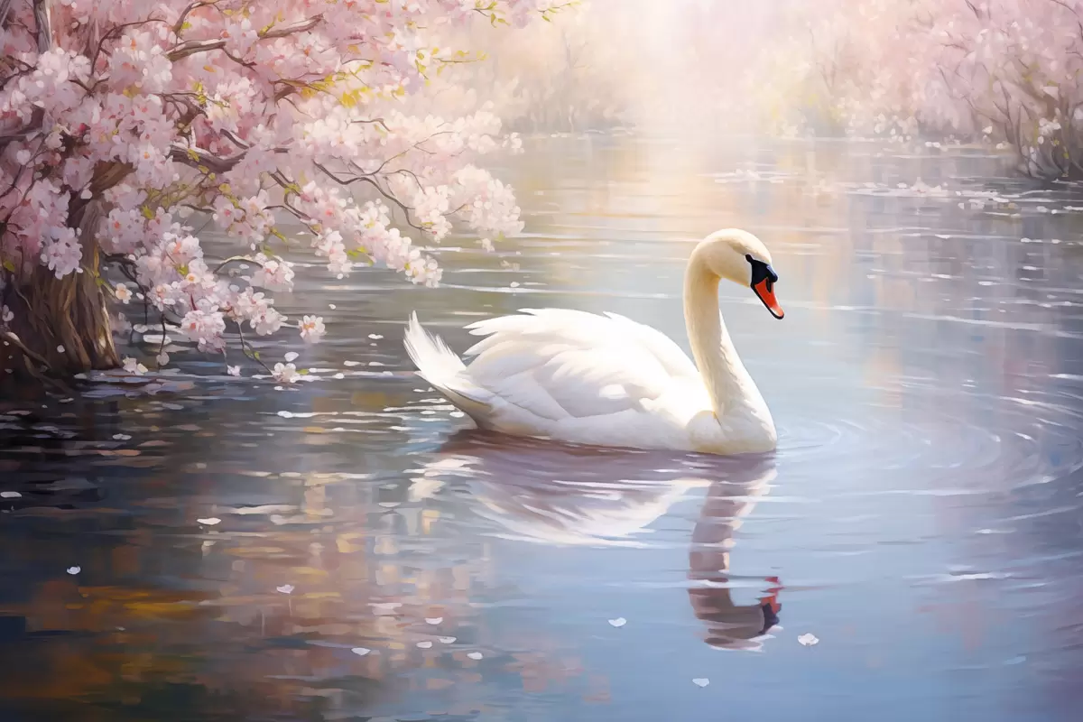 Affiche Un cygne blanc nageant dans un lac avec des cerisiers en fleurs, couleurs pastel Non f44396