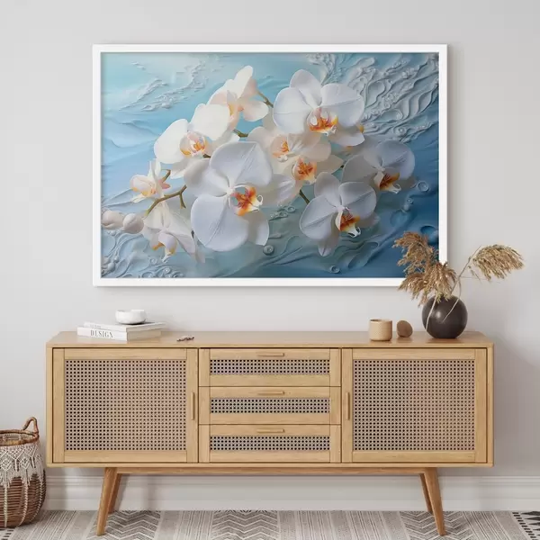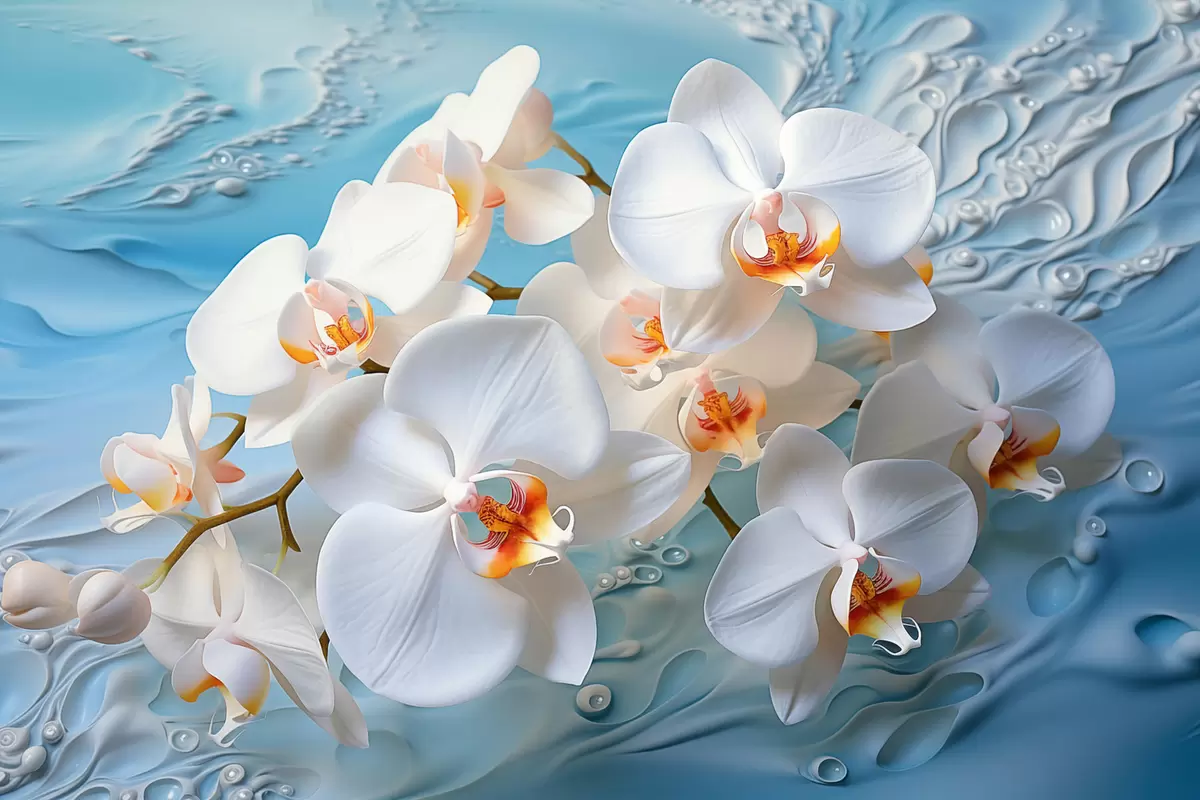 Affiche Orchidées blanches, disposées sur une surface bleu clair avec des gouttelettes d'eau, éclairage doux f44401