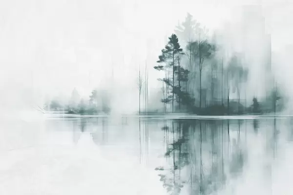 Affiche Forêt abstraite avec de grands arbres se reflétant dans l'eau, palette de couleurs sourdes Non f44403