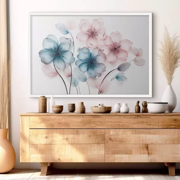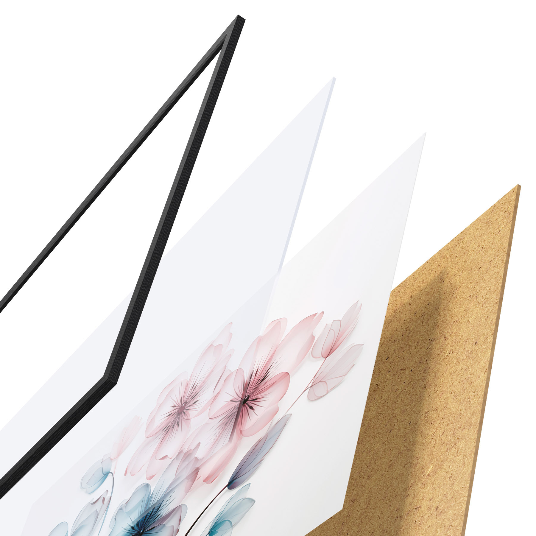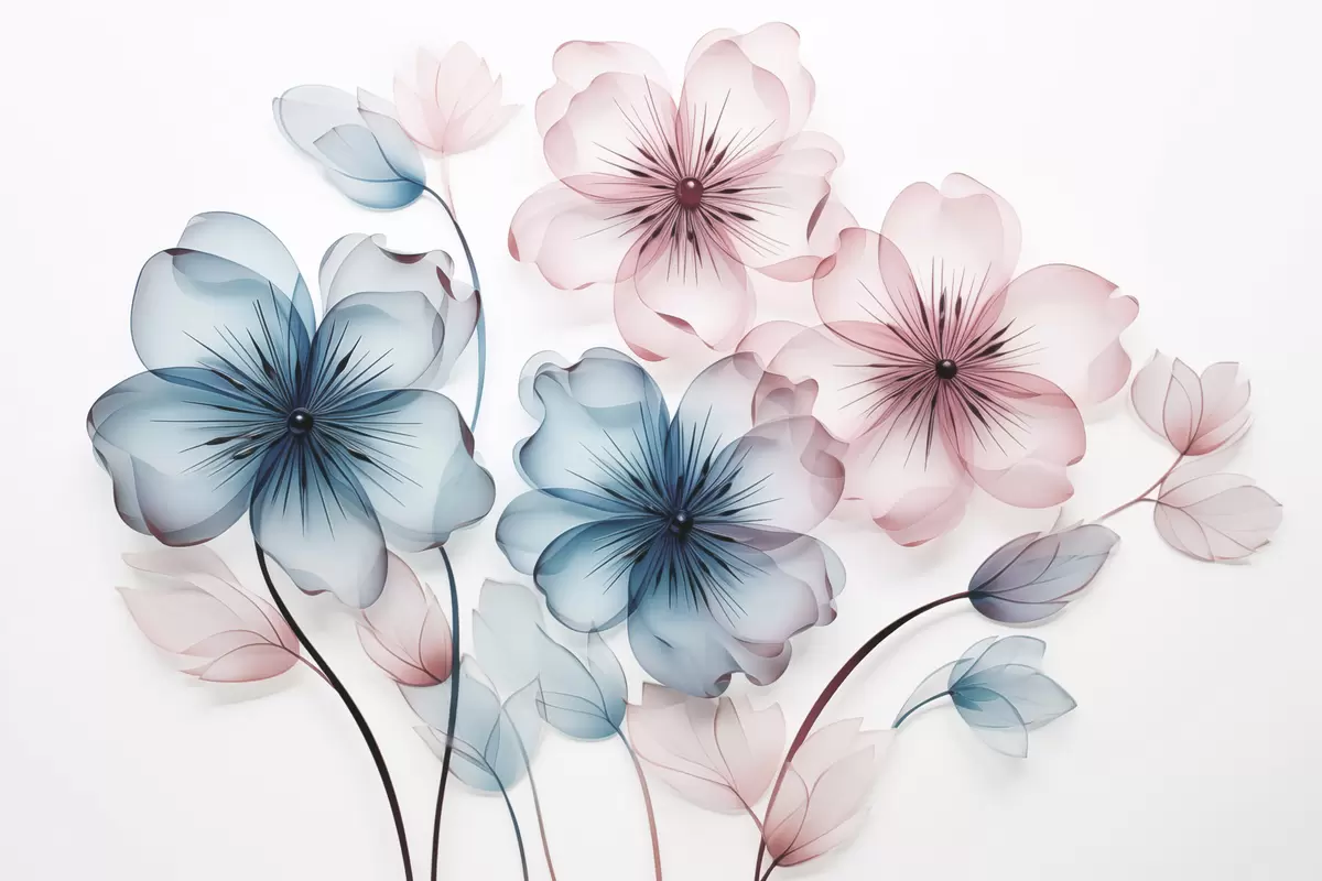 Affiche Fleurs translucides roses et bleues avec étamines et tiges visibles Non f44405