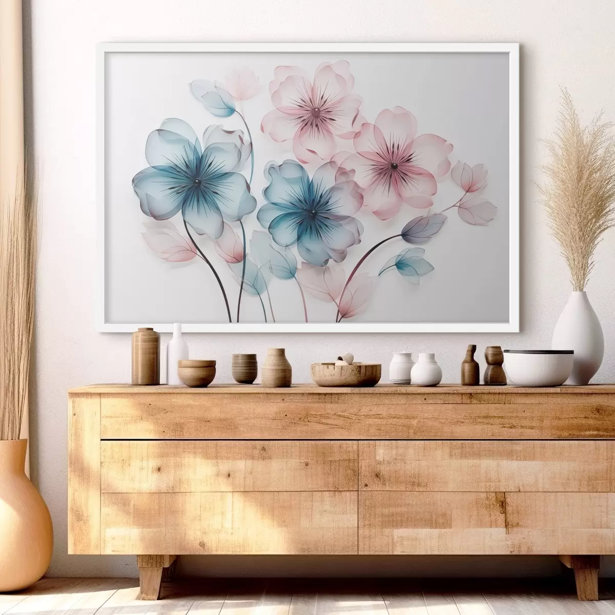 Affiche Fleurs translucides roses et bleues avec étamines et tiges visibles f44405