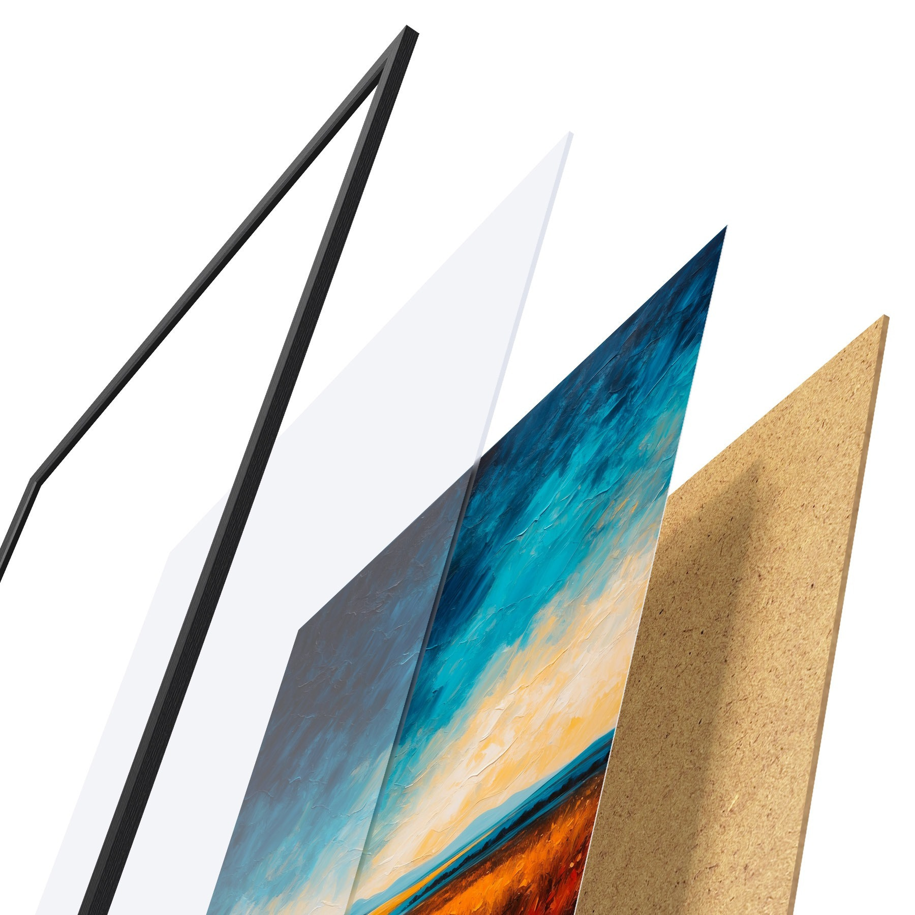 Le poster se compose d'un cadre, d'un plexiglas, d'une image imprimée et d'un support en aggloméré. Le poster peut être immédiatement accroché au mur grâce aux fixations au dos.