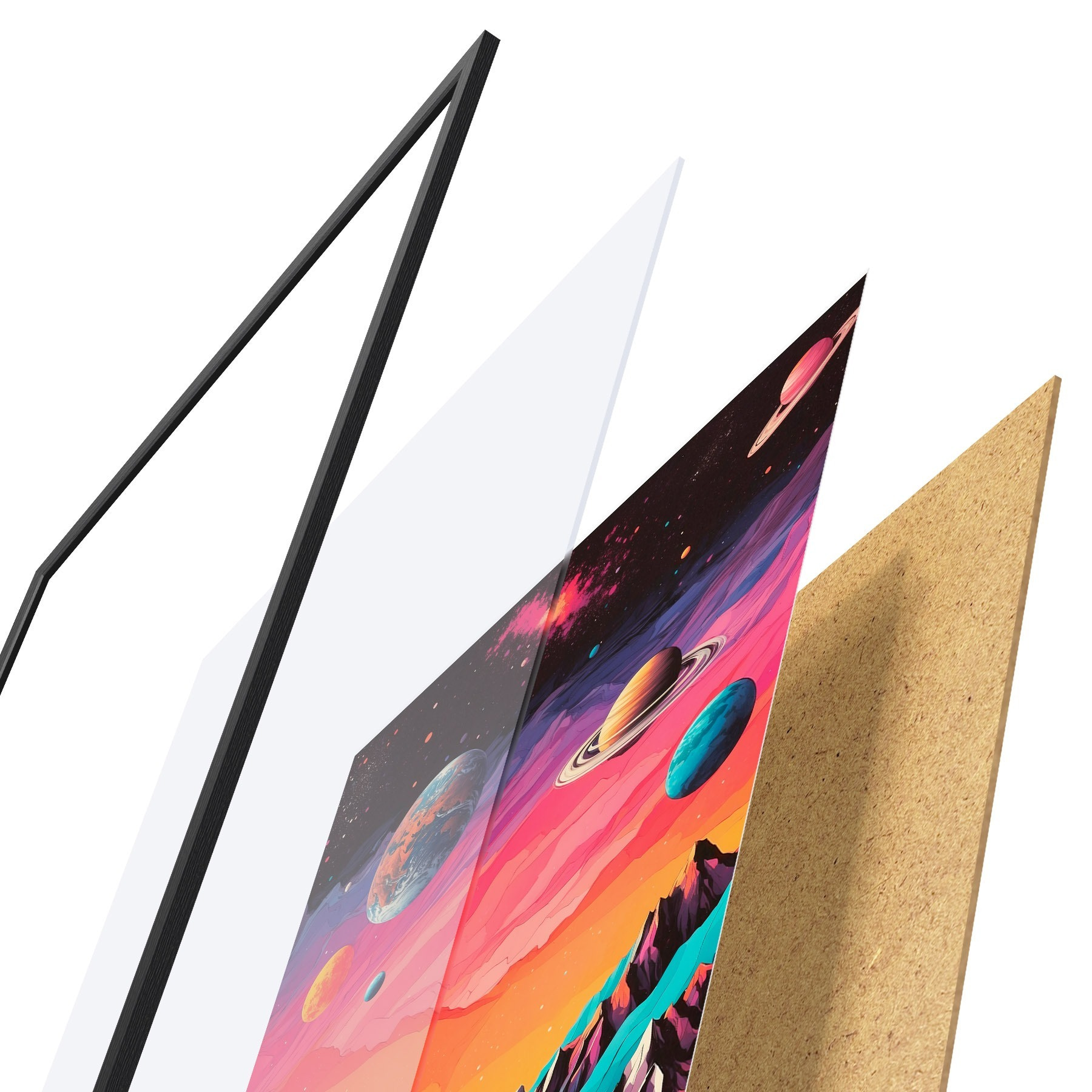 Le poster se compose d'un cadre, d'un plexiglas, d'une image imprimée et d'un support en aggloméré. Le poster peut être immédiatement accroché au mur grâce aux fixations au dos.
