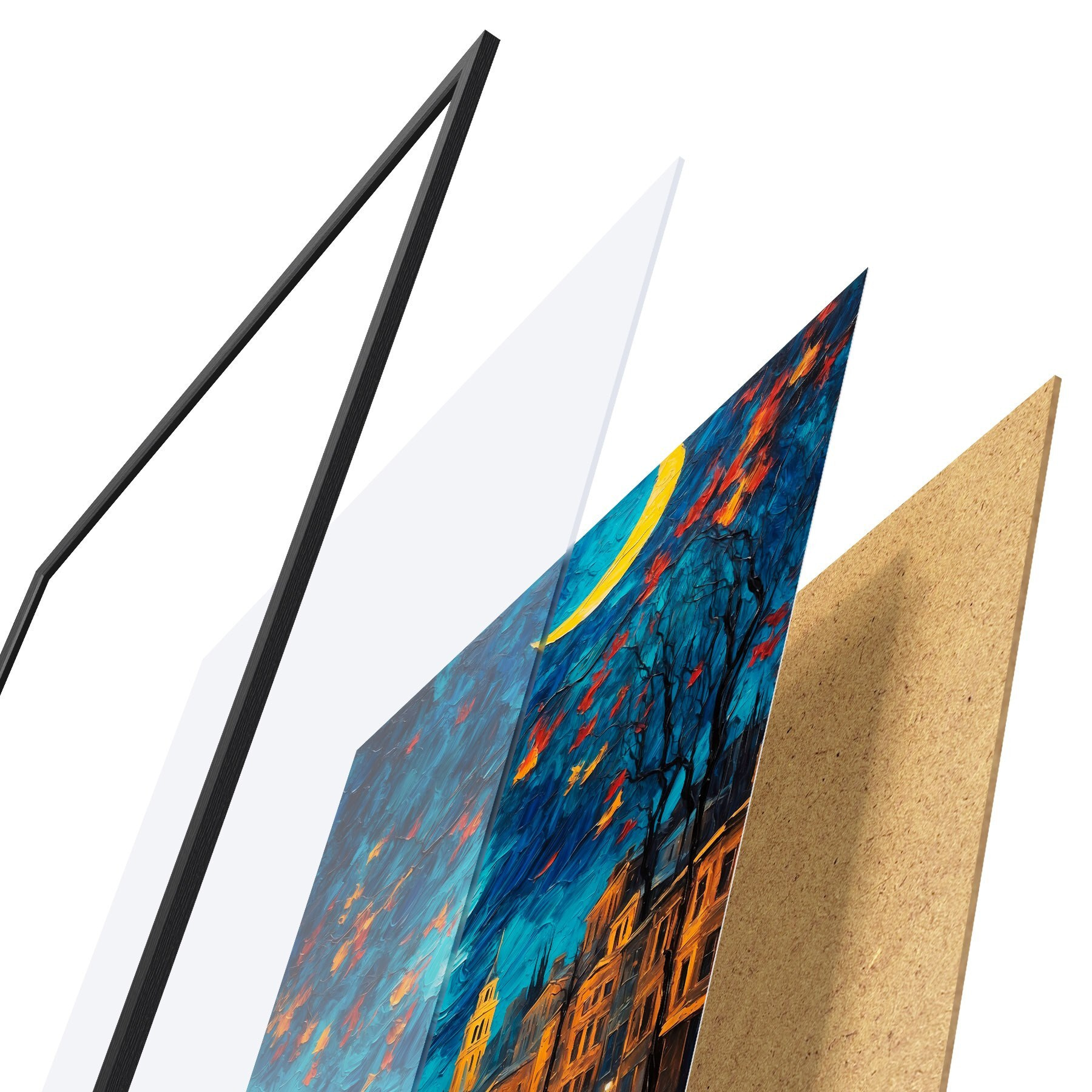 Le poster se compose d'un cadre, d'un plexiglas, d'une image imprimée et d'un support en aggloméré. Le poster peut être immédiatement accroché au mur grâce aux fixations au dos.