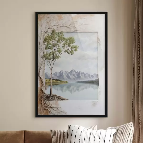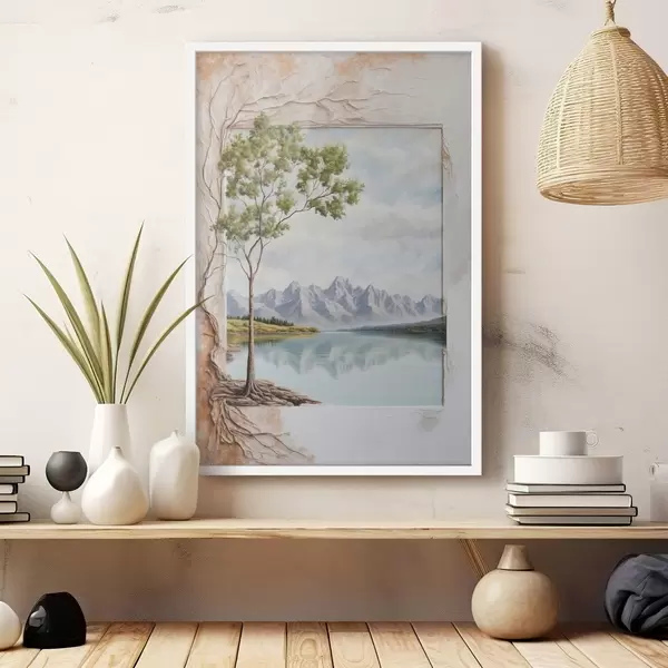 Affiche Vue sur le lac et les montagnes enneigées dans le cadre f44458
