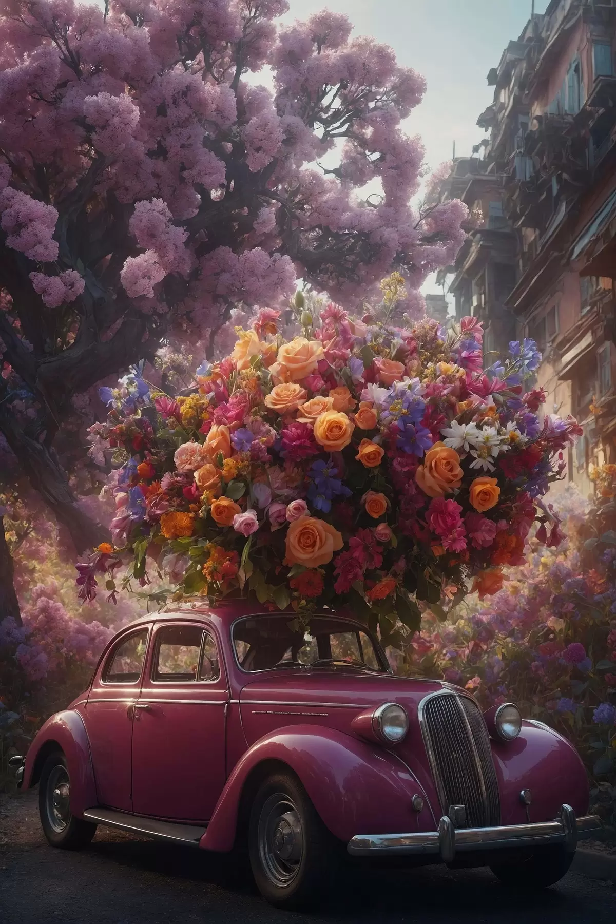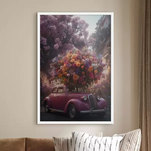 Affiche Voiture rétro et énorme bouquet de fleurs f44471