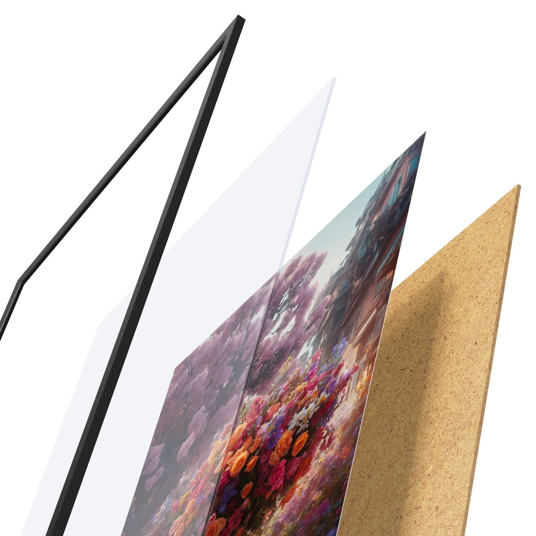 Le poster se compose d'un cadre, d'un plexiglas, d'une image imprimée et d'un support en aggloméré. Le poster peut être immédiatement accroché au mur grâce aux fixations au dos.