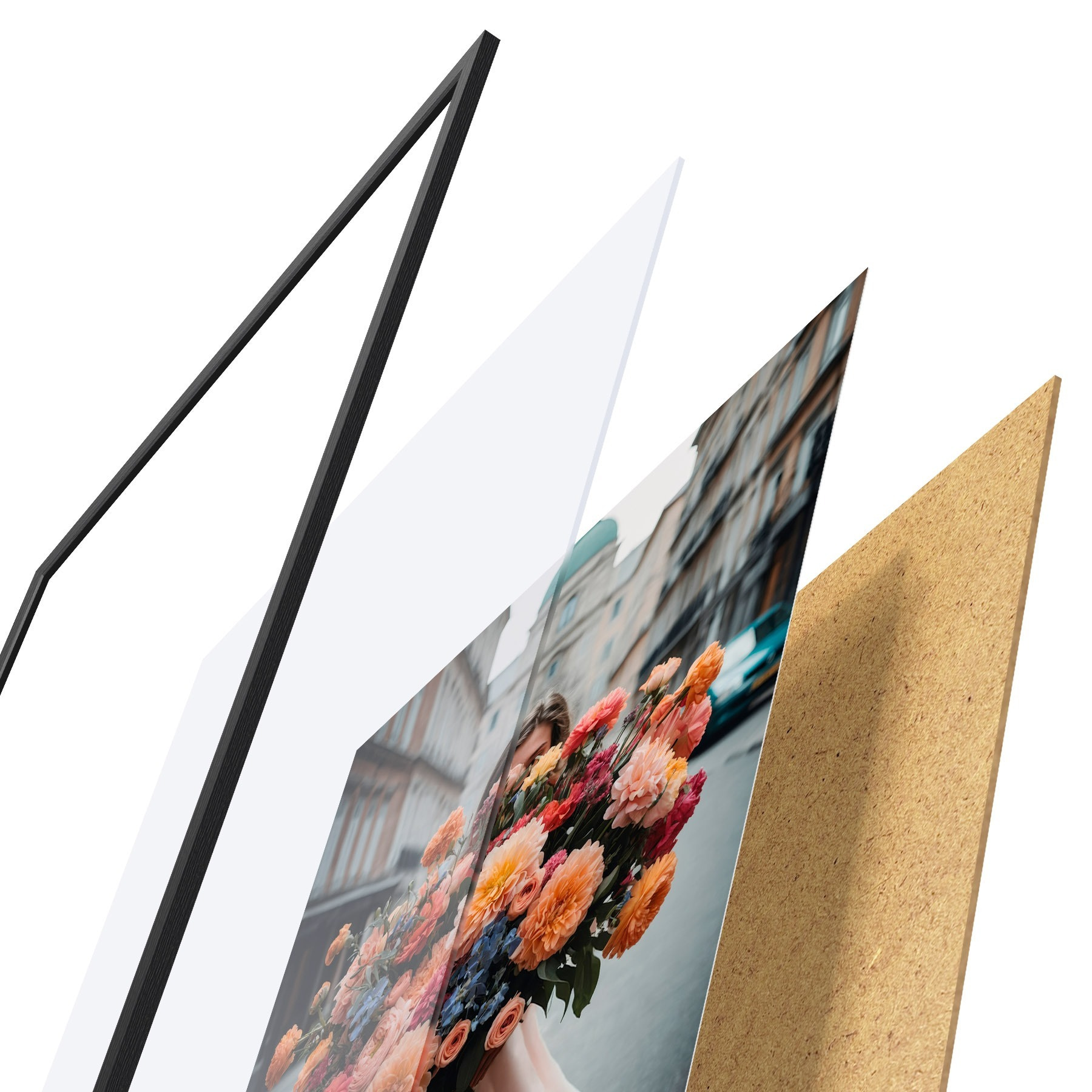 Le poster se compose d'un cadre, d'un plexiglas, d'une image imprimée et d'un support en aggloméré. Le poster peut être immédiatement accroché au mur grâce aux fixations au dos.